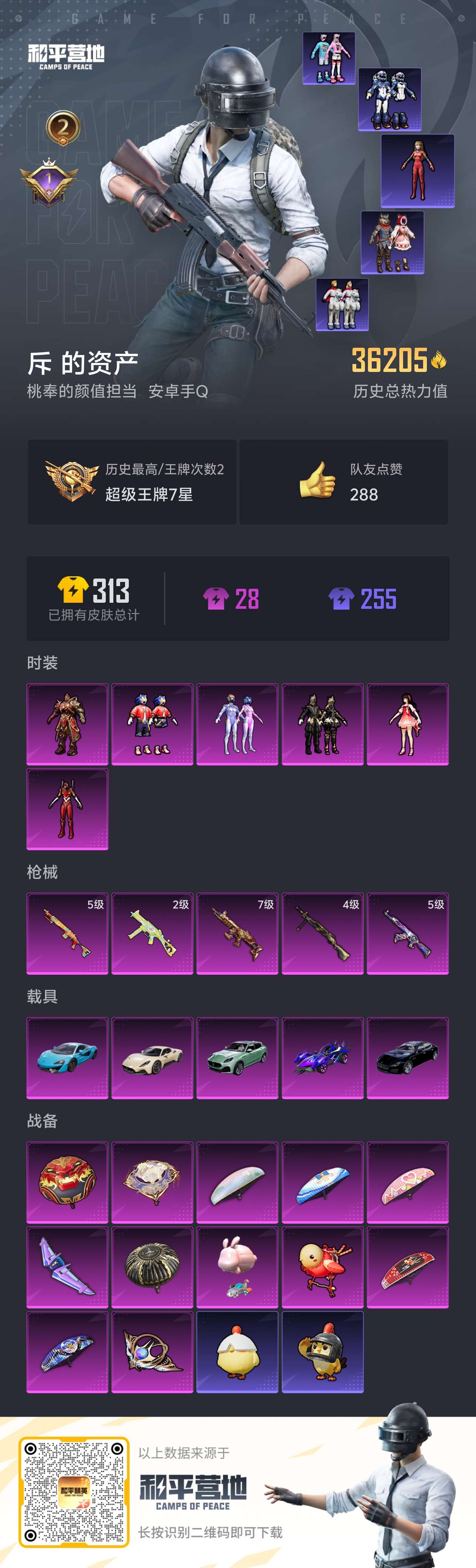 安卓 手Q-3粉装-5特效枪-1载具-1粉色飞行器-50085热力值-3王牌印