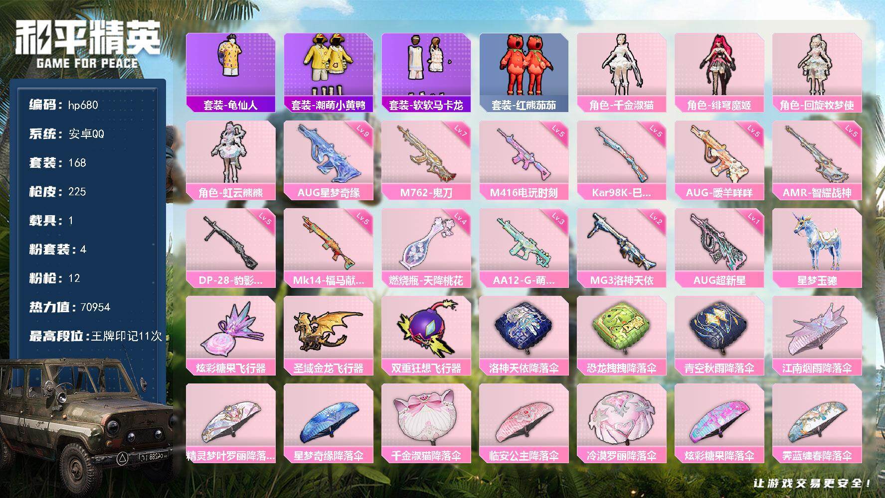 安卓 手Q-4粉装-12特效枪-1载具-4粉色飞行器-70954热力值-11王