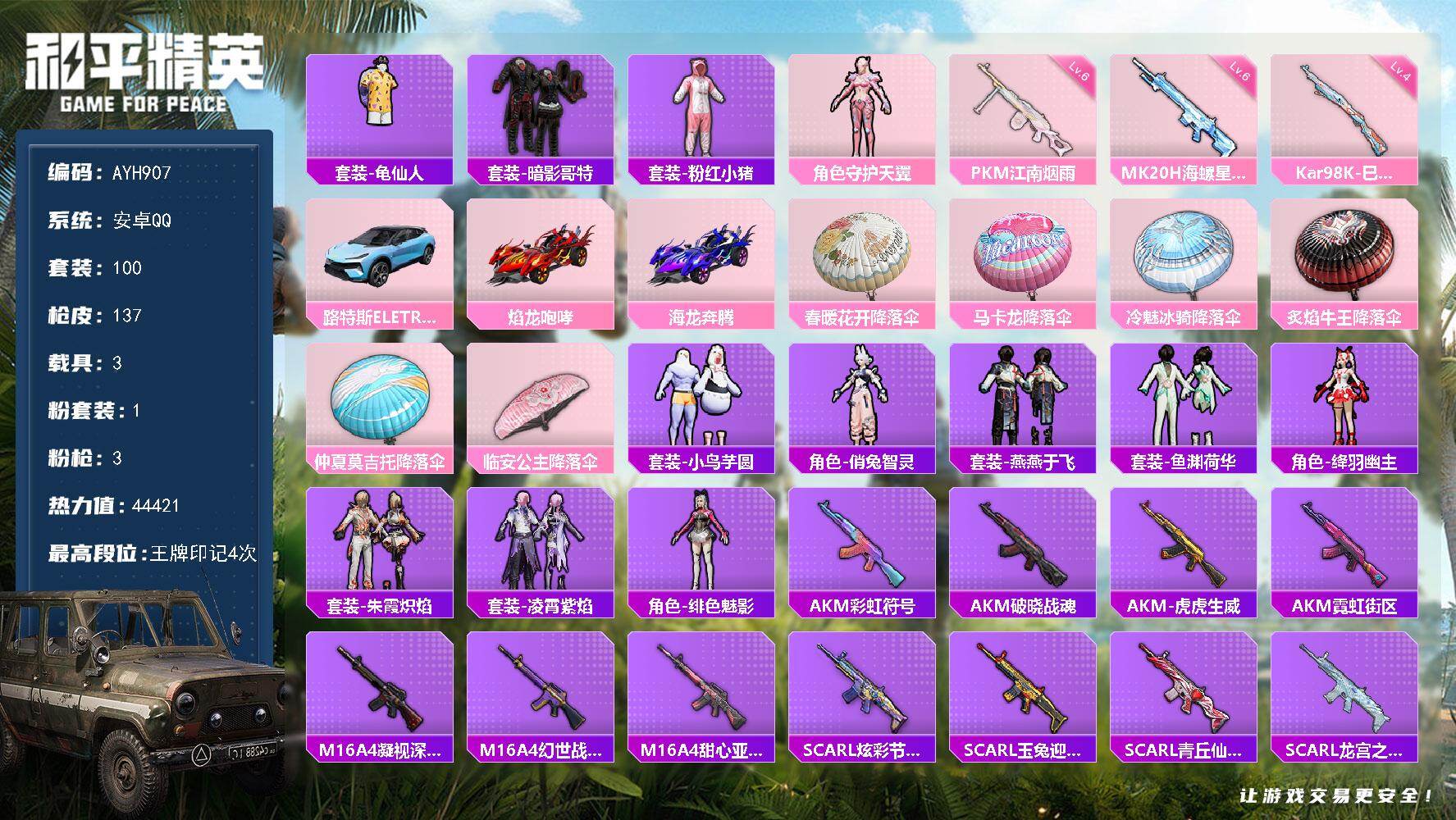 安卓 手Q-1粉装-3特效枪-3载具-0粉色飞行器-44421热力值-4王牌印