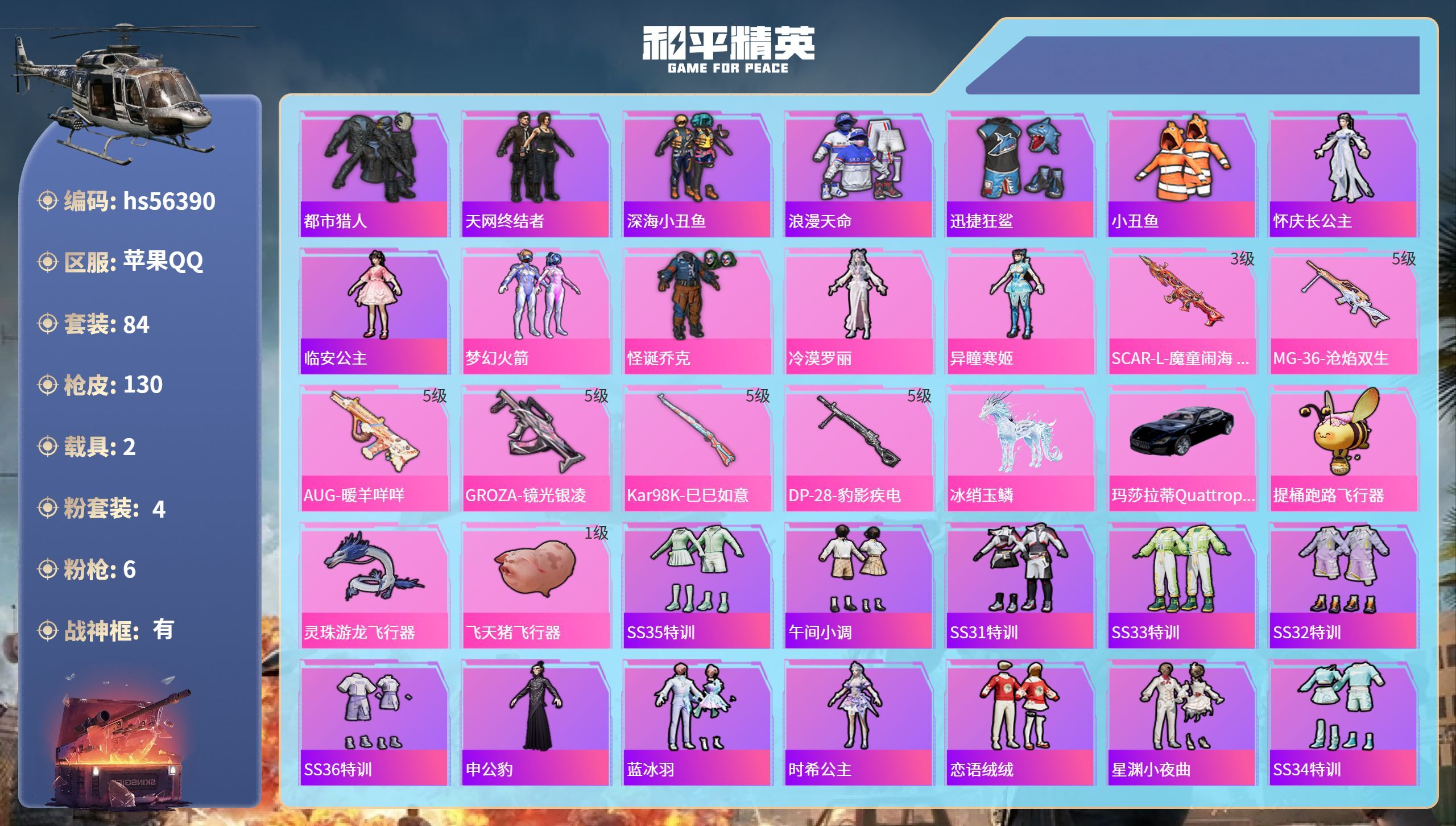 hs56390 苹果手Q-7王牌印记-有战神框-4粉装-6特效枪-2载具-40247热力值-84套装