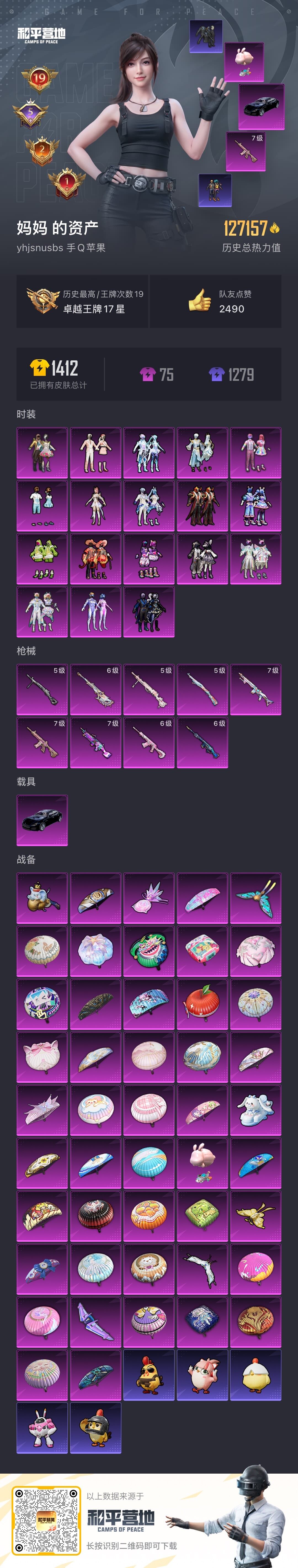 1稀有1载具7粉装6特效枪11热门160套装240枪皮 74902热力值 16印记 历史卓越王牌14星