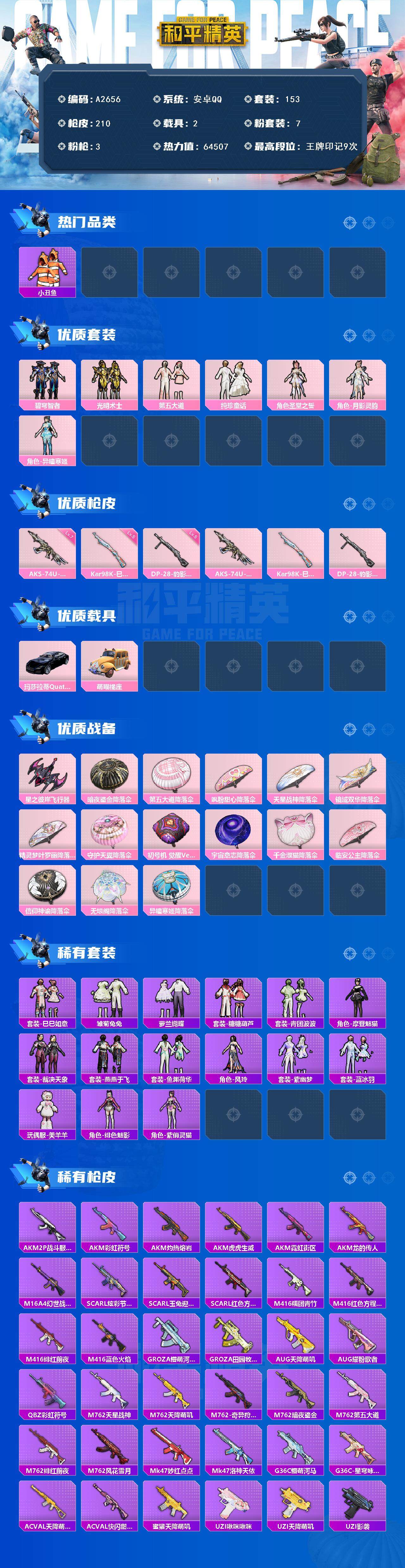 安卓 手Q-6粉装-4特效枪-1载具-1粉色飞行器-74408热力值-15王牌