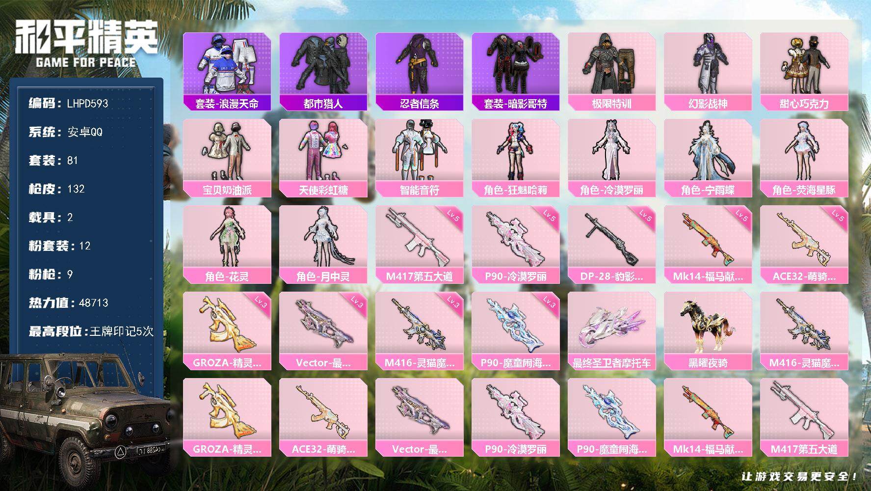 【店主推荐捡漏号!可直接换绑】安卓 手Q-1神装-9粉装-15特效枪-1载具-