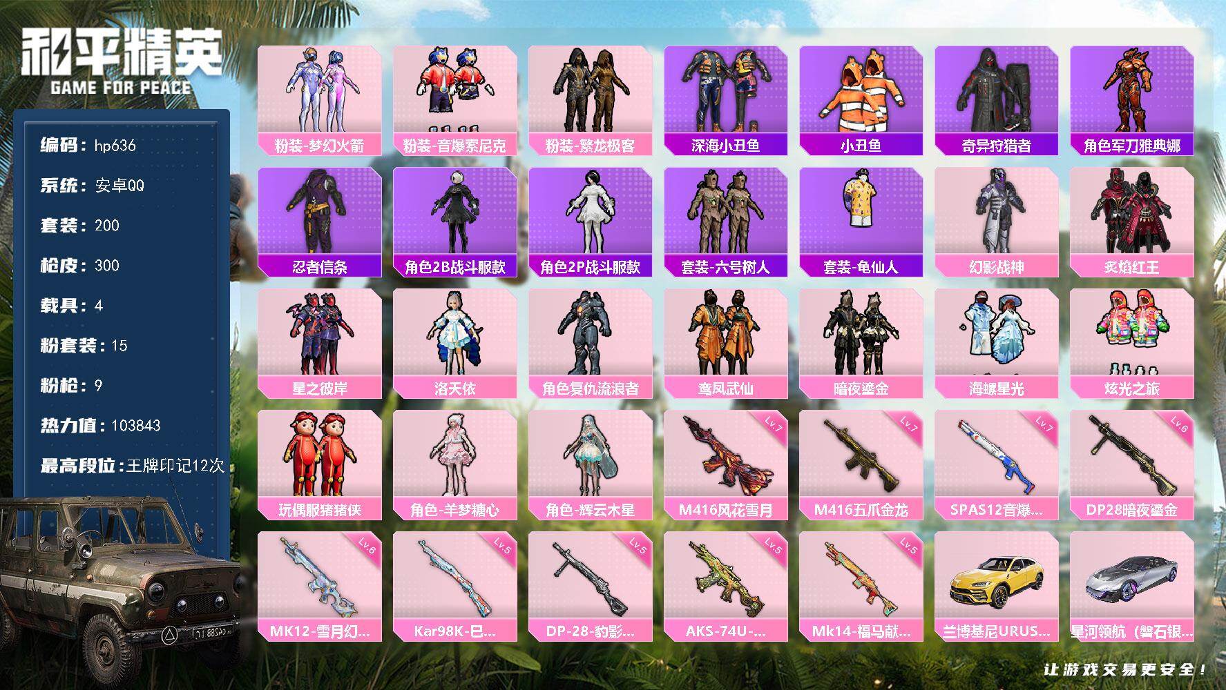 15粉装-9特效枪-4载具-5粉色飞行器-103843热力值-12王牌印记-200套装-300枪皮