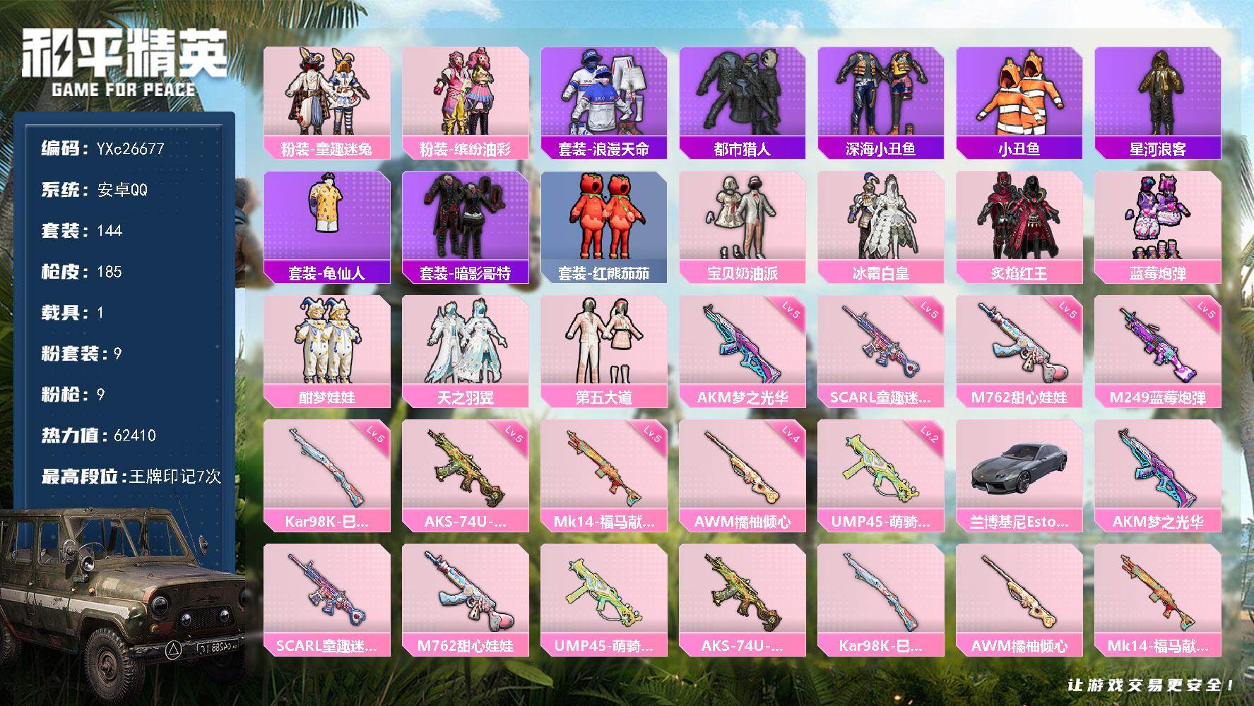 苹果 手Q-1神装-12粉装-12特效枪-3载具-6粉色飞行器-99148热力值