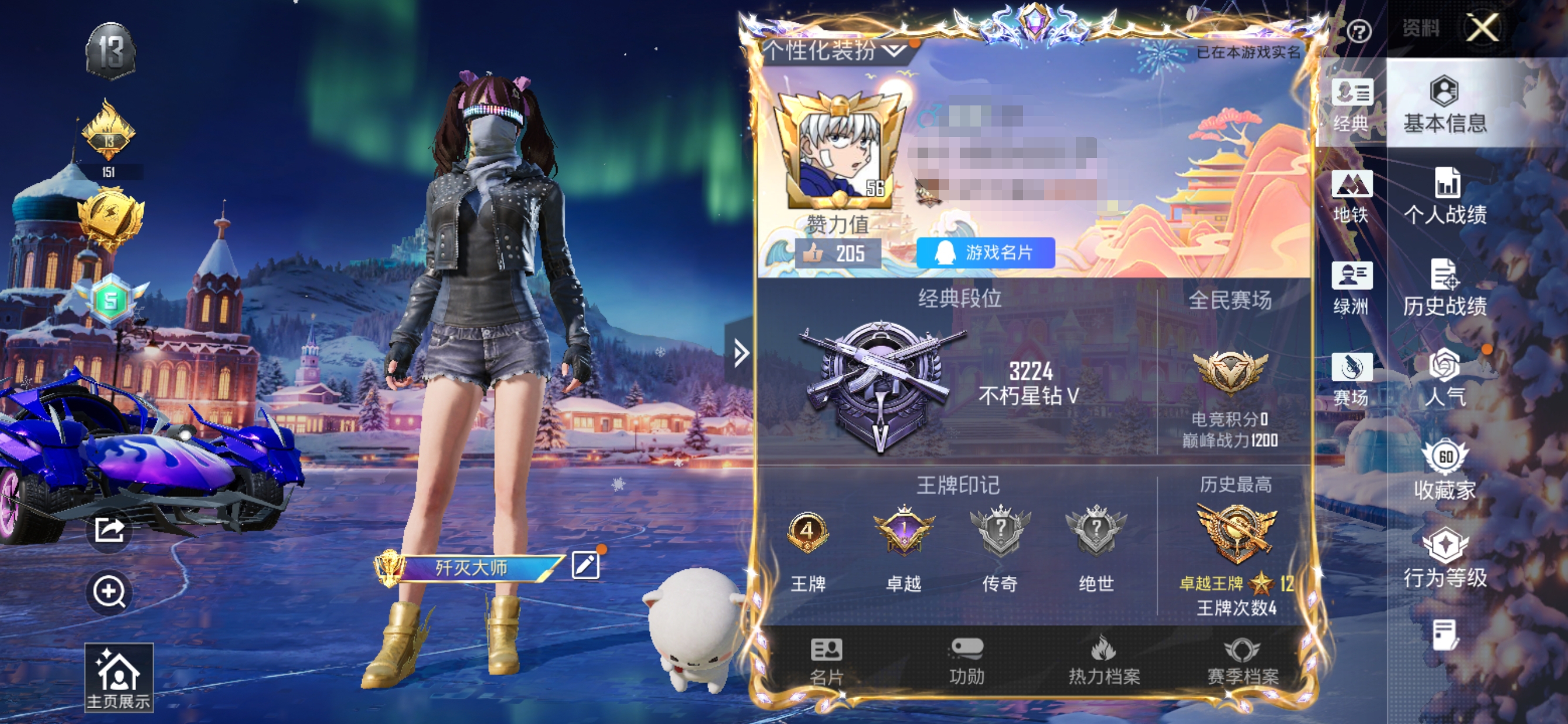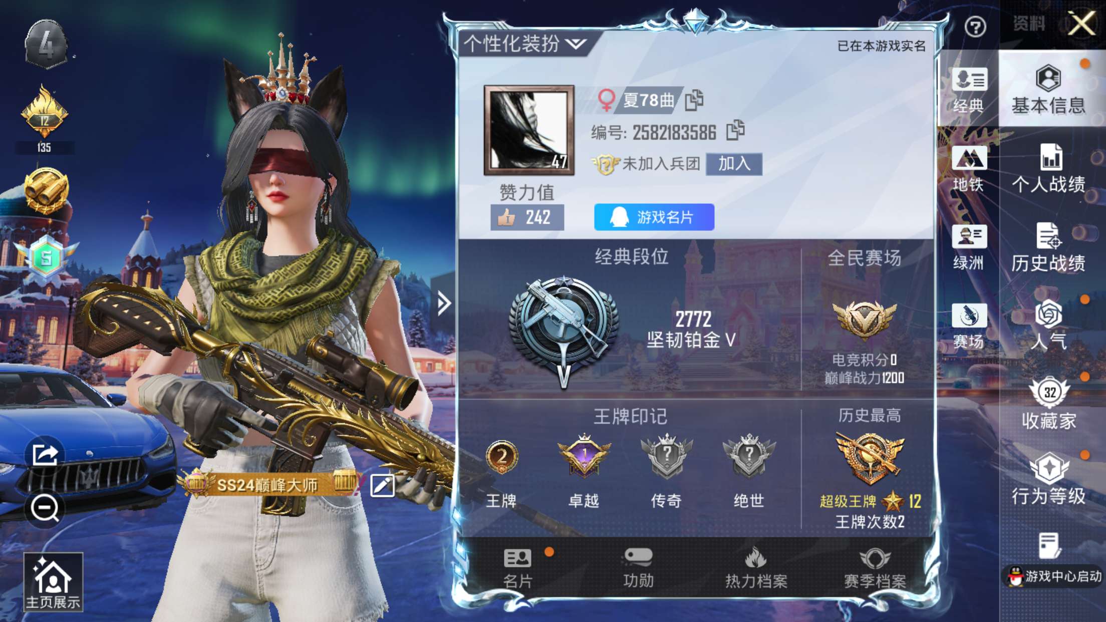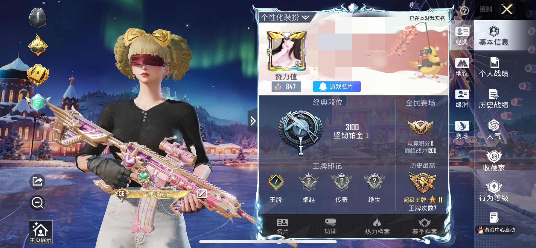 3稀有1载具2粉装2特效枪12热门152套装195枪皮 53993热力值 1印记 历史超级王牌