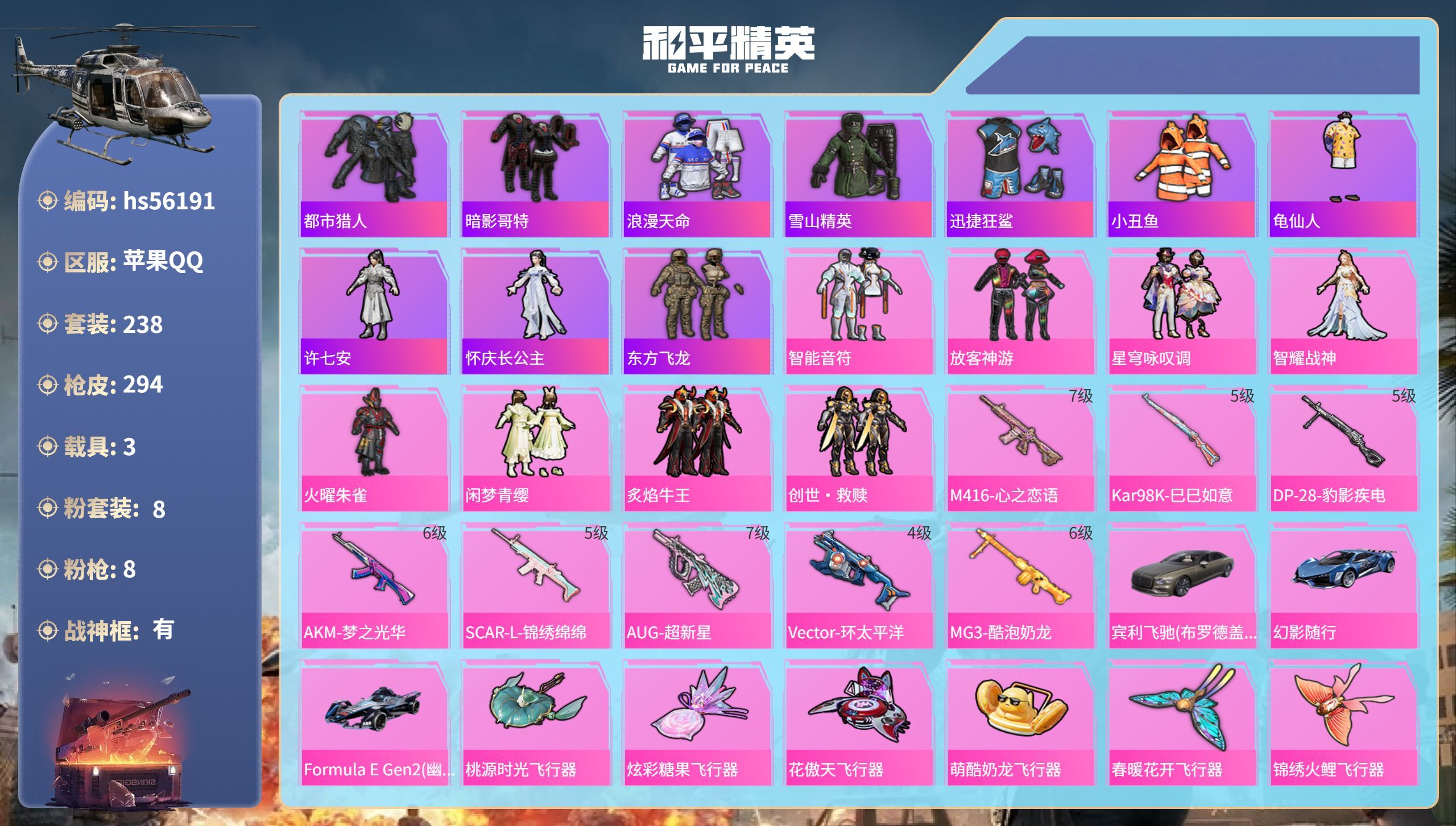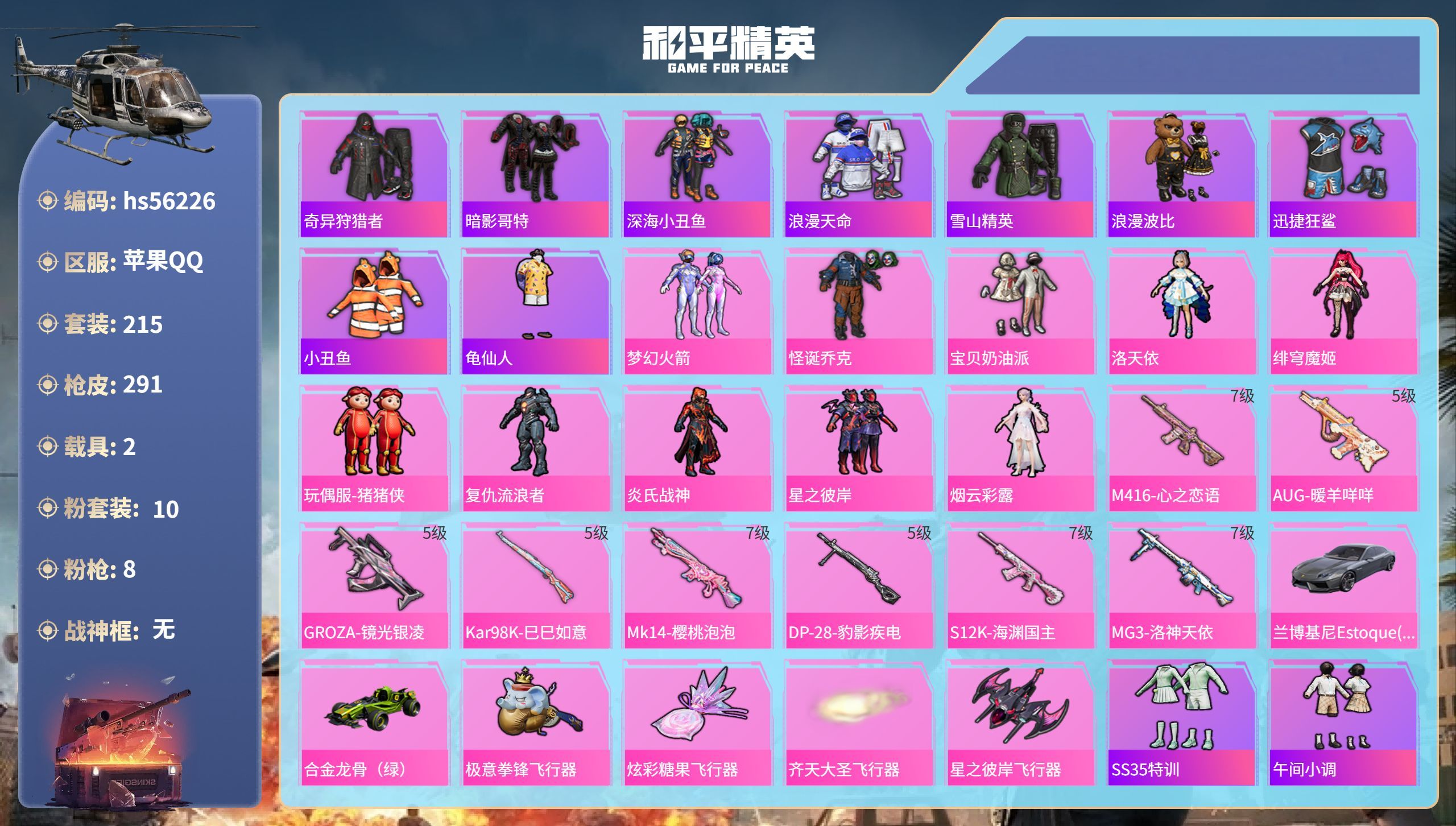 hs56217 苹果手Q-13王牌印记-12粉装-14特效枪-1载具-105126热力值-218套装