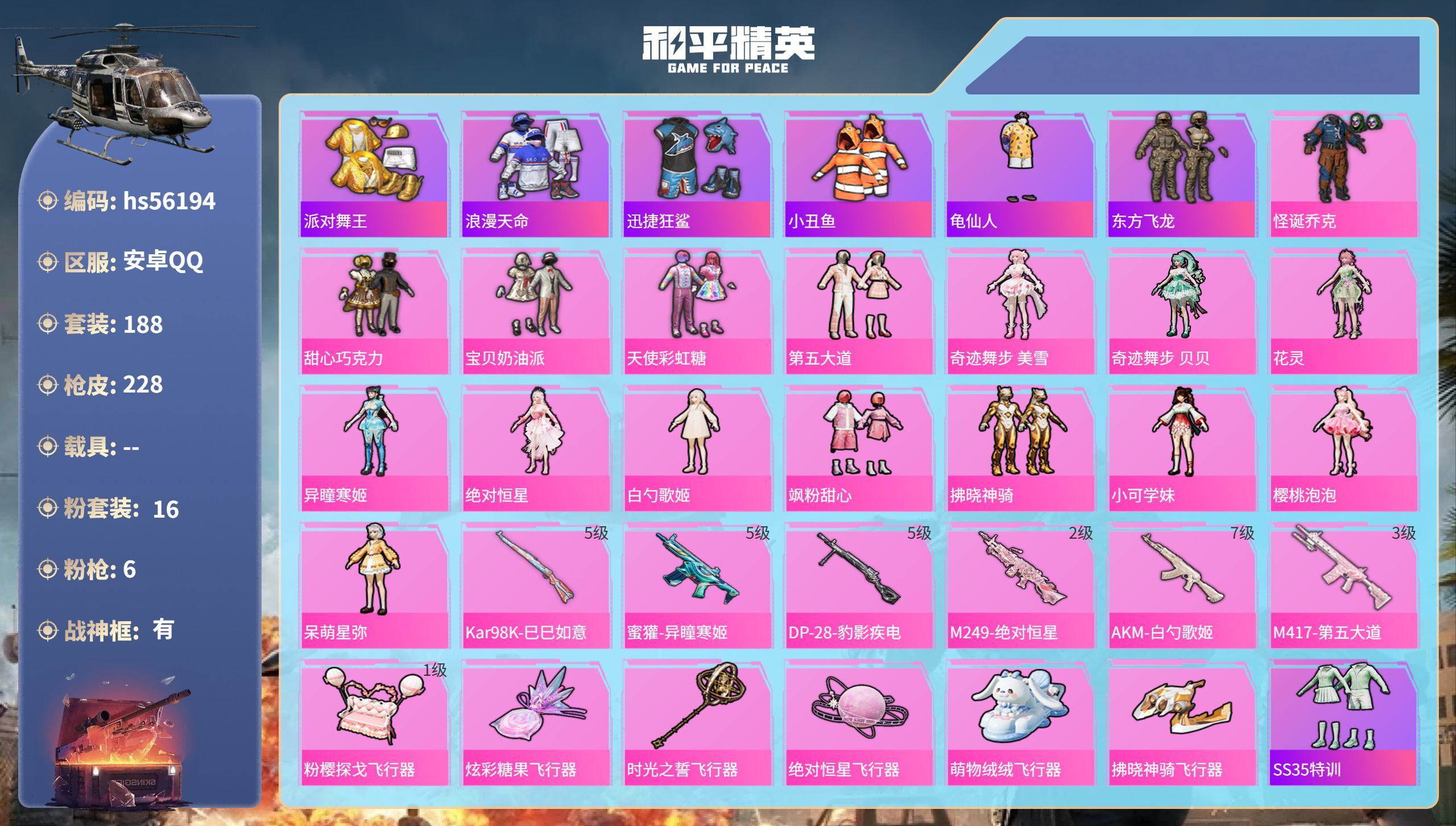 hs56194 安卓手Q-14王牌印记-有战神框-16粉装-6特效枪-72757热力值-188套装-