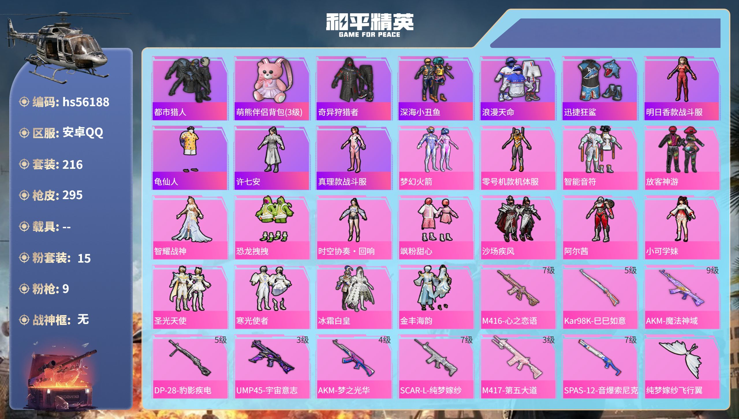 hs56188 安卓手Q-19王牌印记-15粉装-9特效枪-104130热力值-216套装-295枪