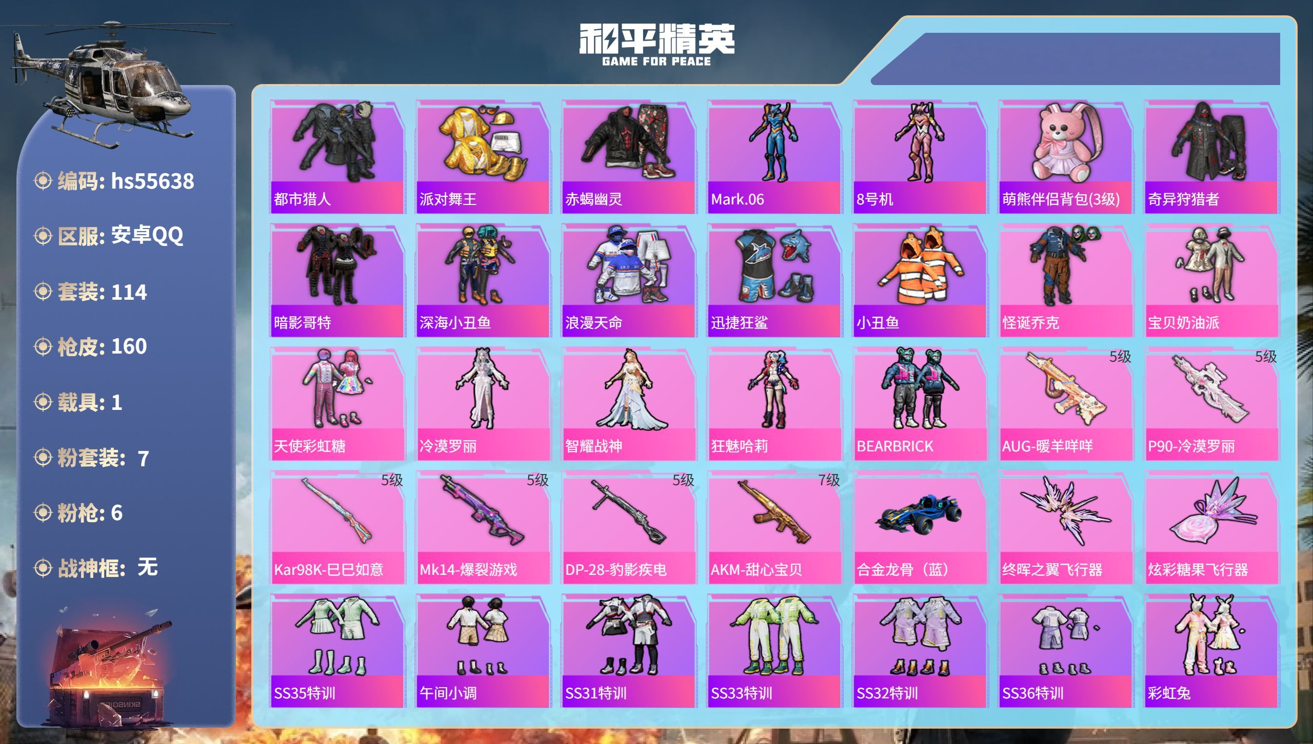 hs55638 安卓手Q-5王牌印记-7粉装-6特效枪-1载具-49175热力值-114套装-160