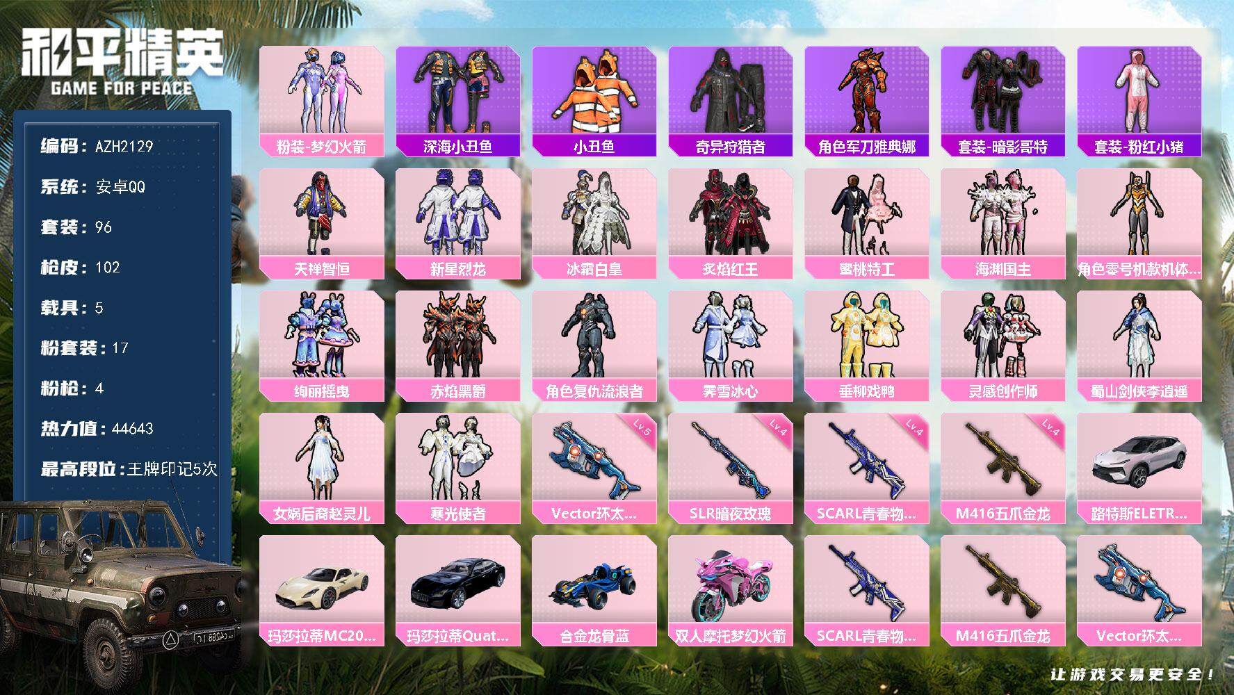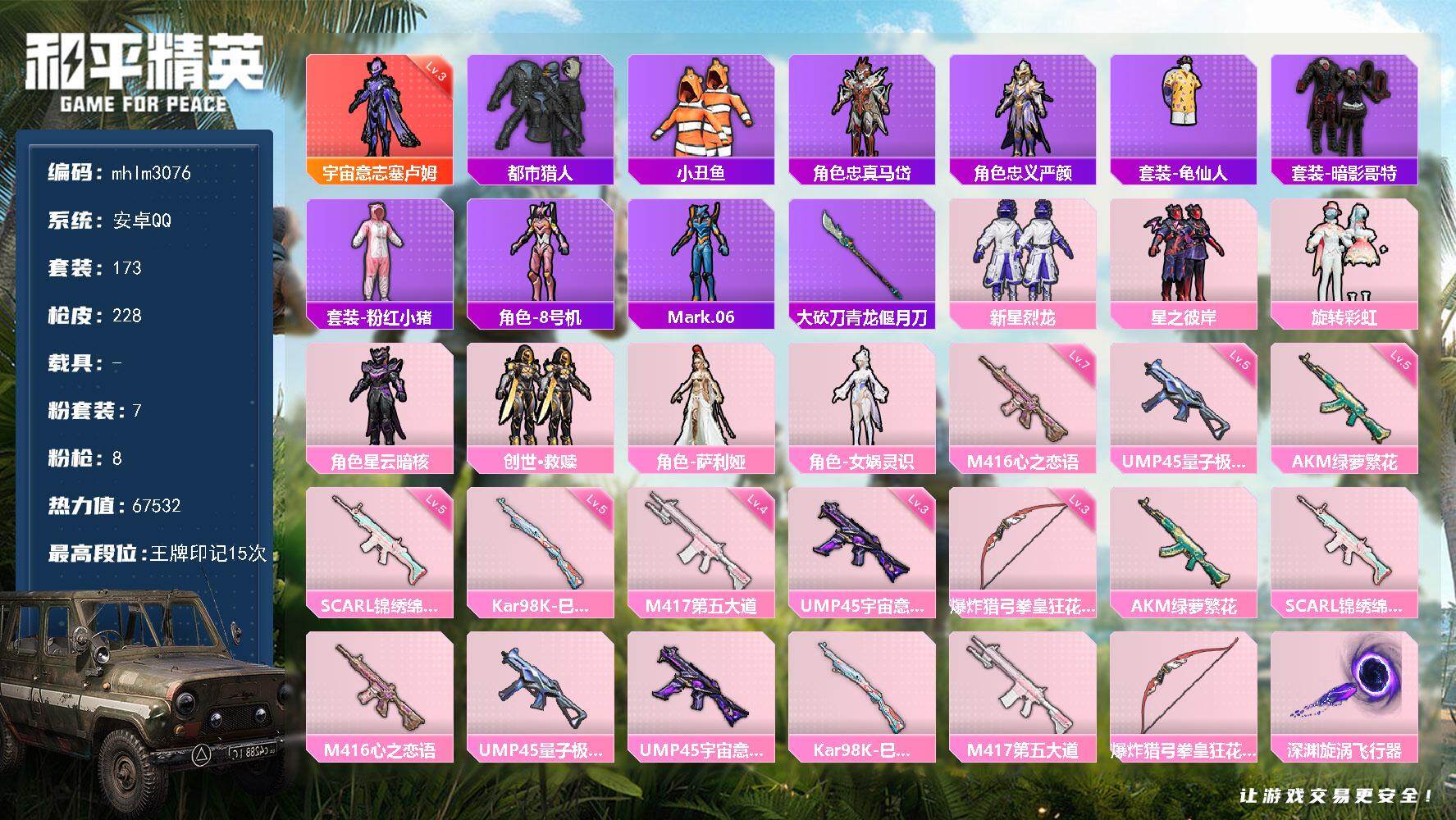 安卓 手Q-11粉装-2特效枪-2载具-0粉色飞行器-44176热力值-7王牌