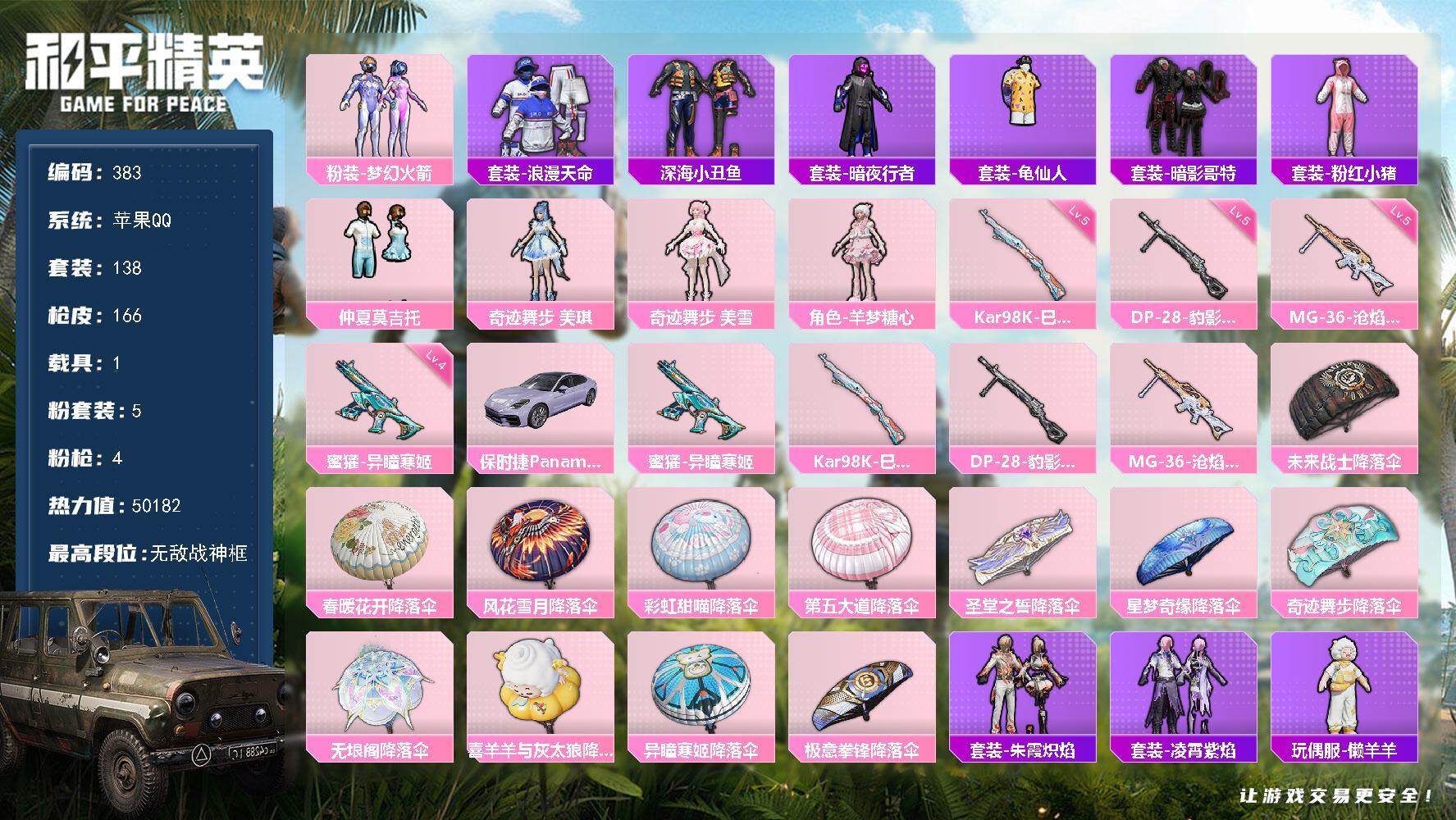 苹果 手Q-无敌战神框-5粉装-4特效枪-1载具-1粉色飞行器-50182热力