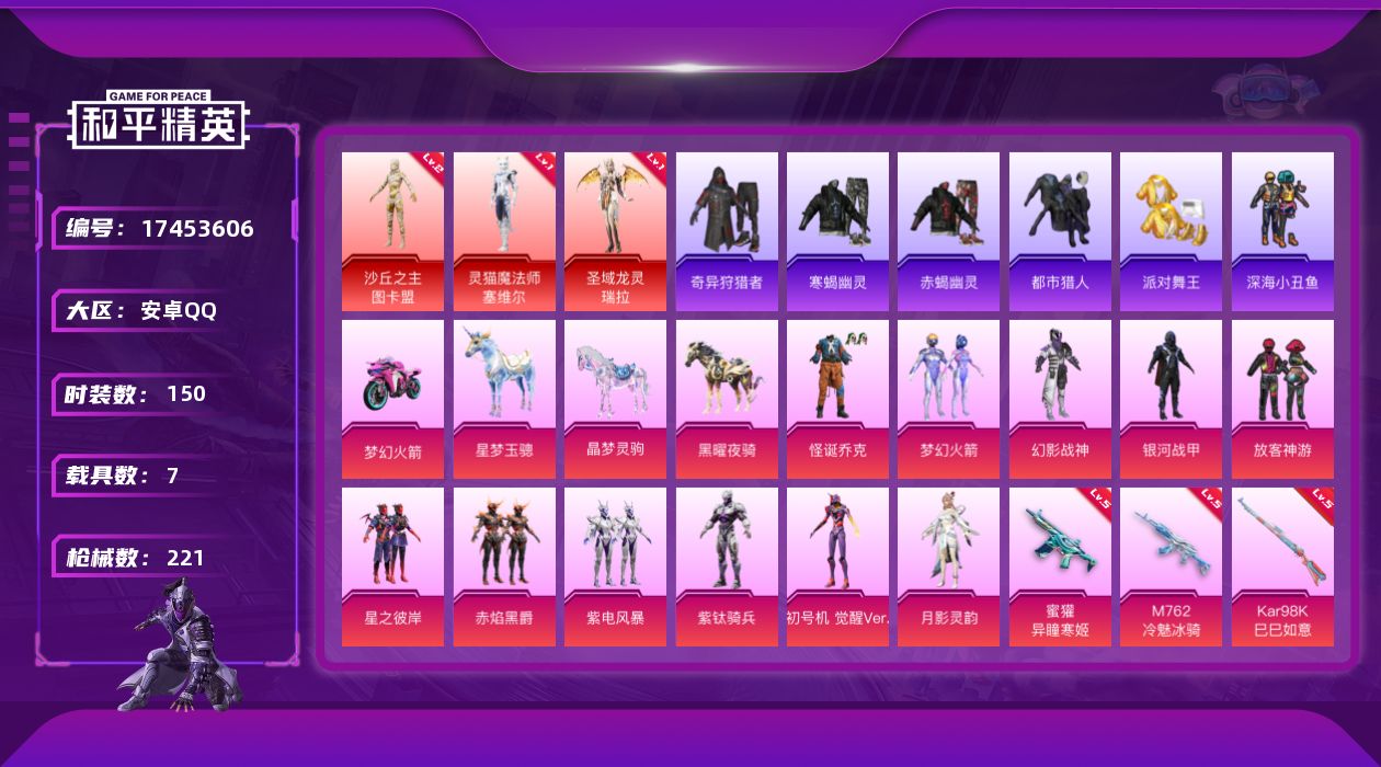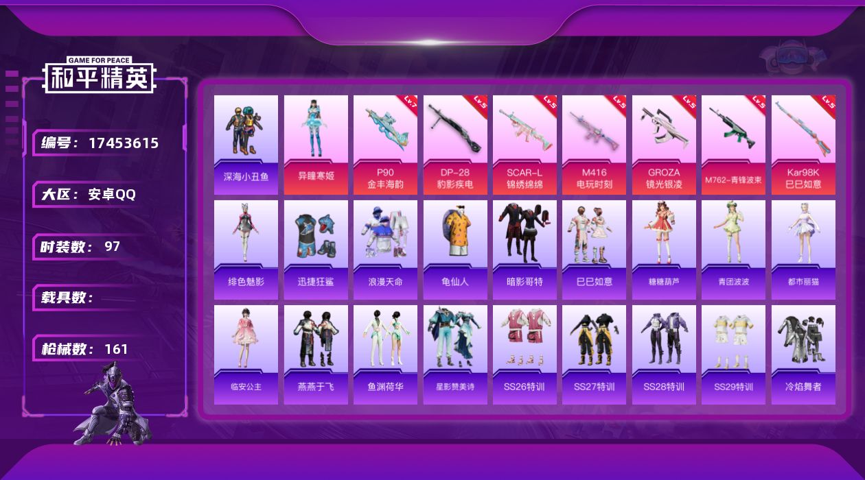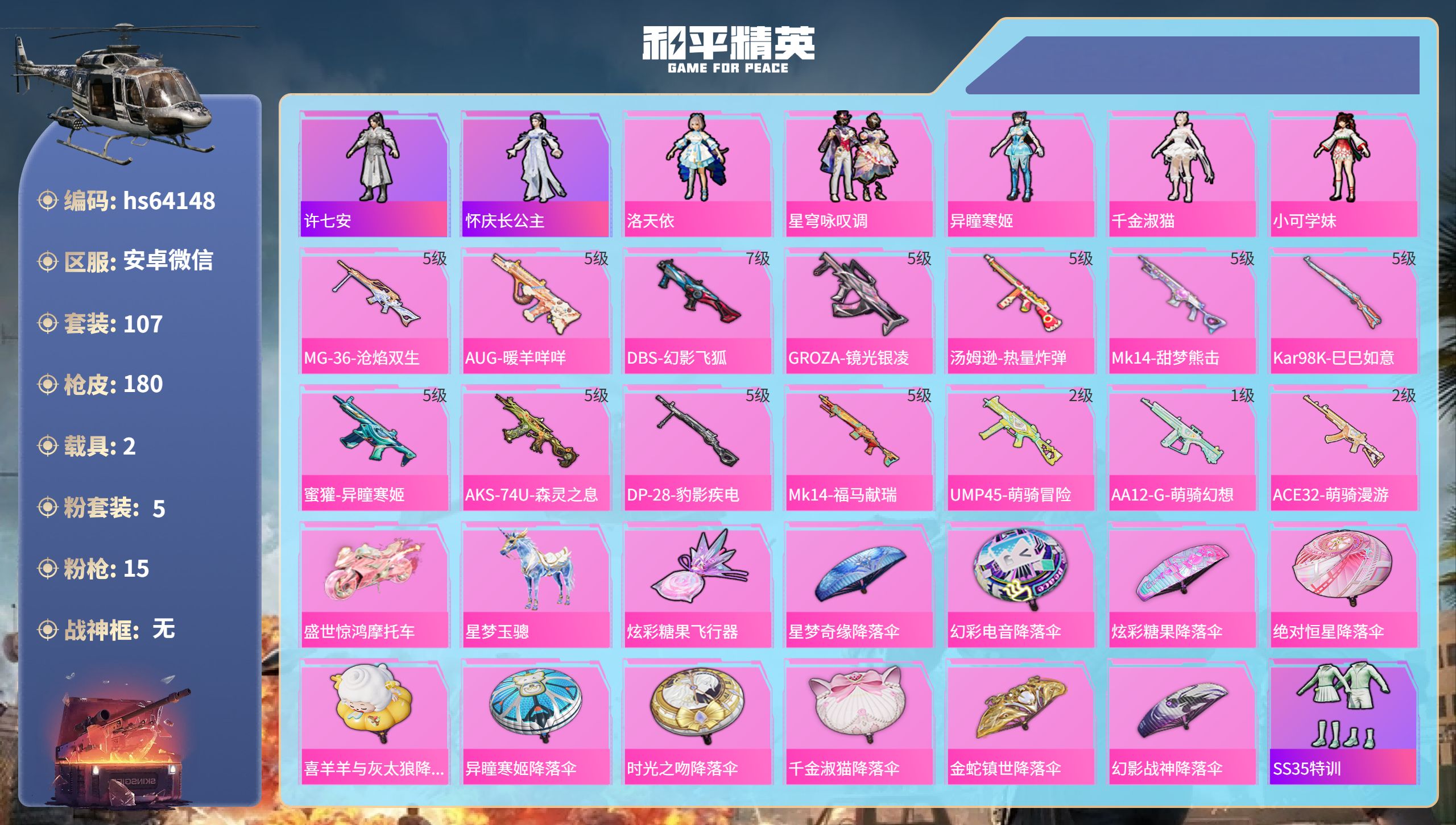 安卓 手Q-1神装-13粉装-17特效枪-3载具-7粉色飞行