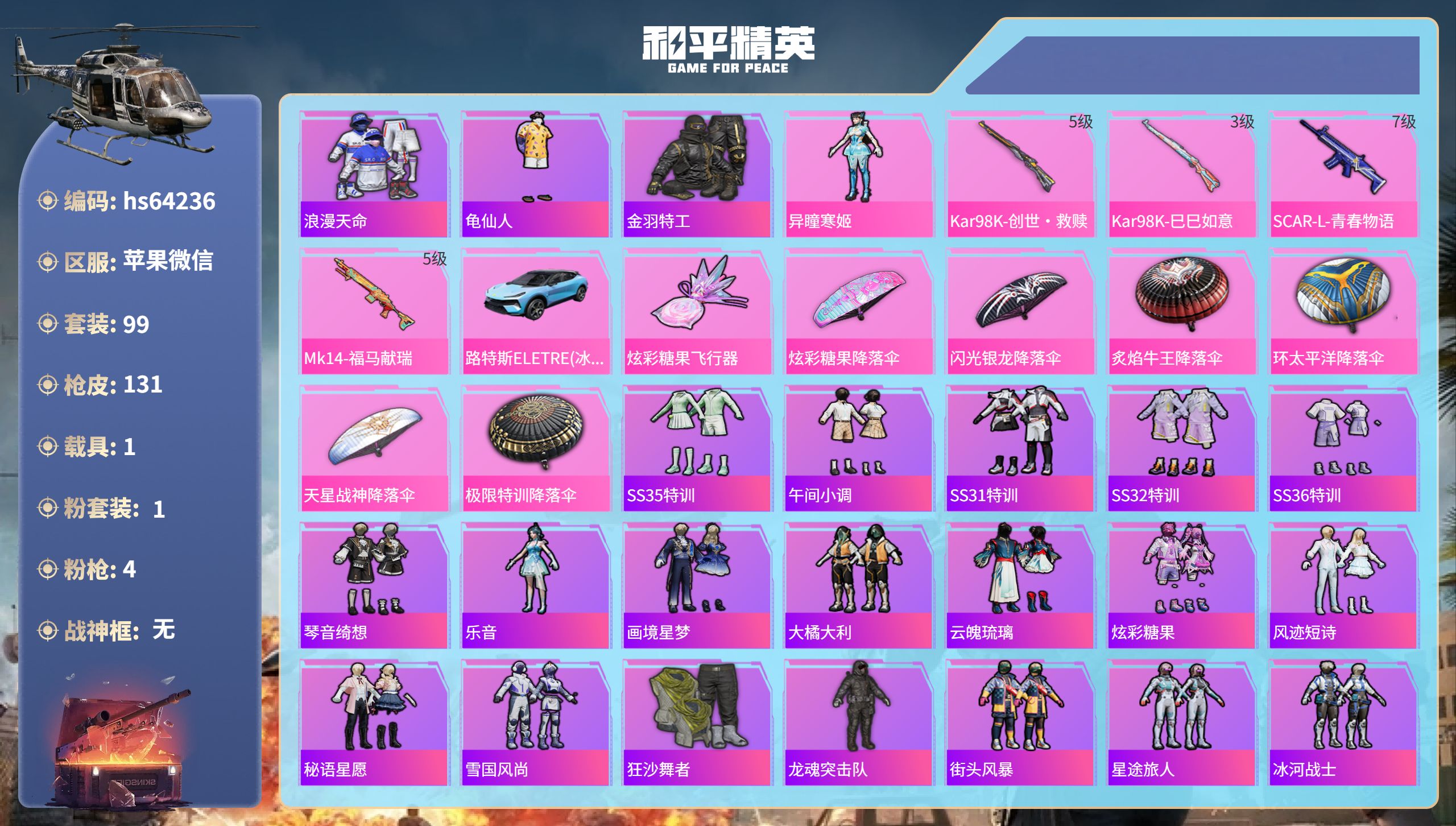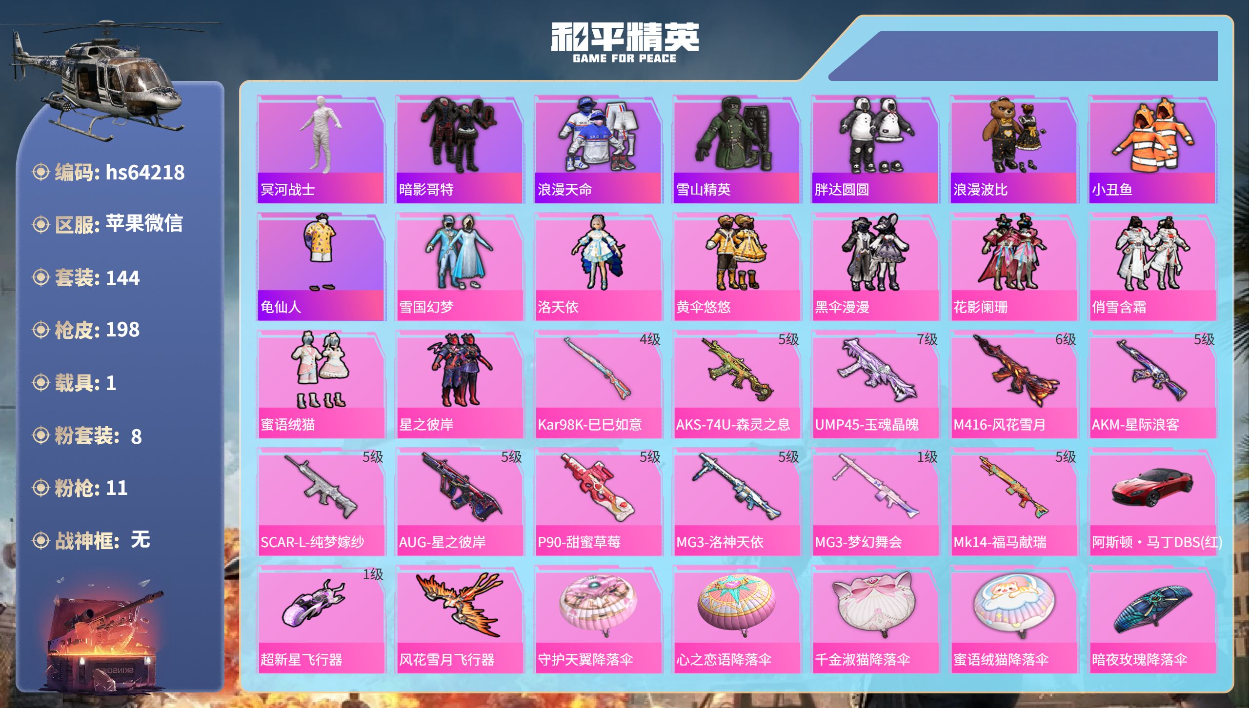 hs63641 苹果手Q-6王牌印记-1红装-1粉装-9特效枪-1载具-28887热力值-49套装-
