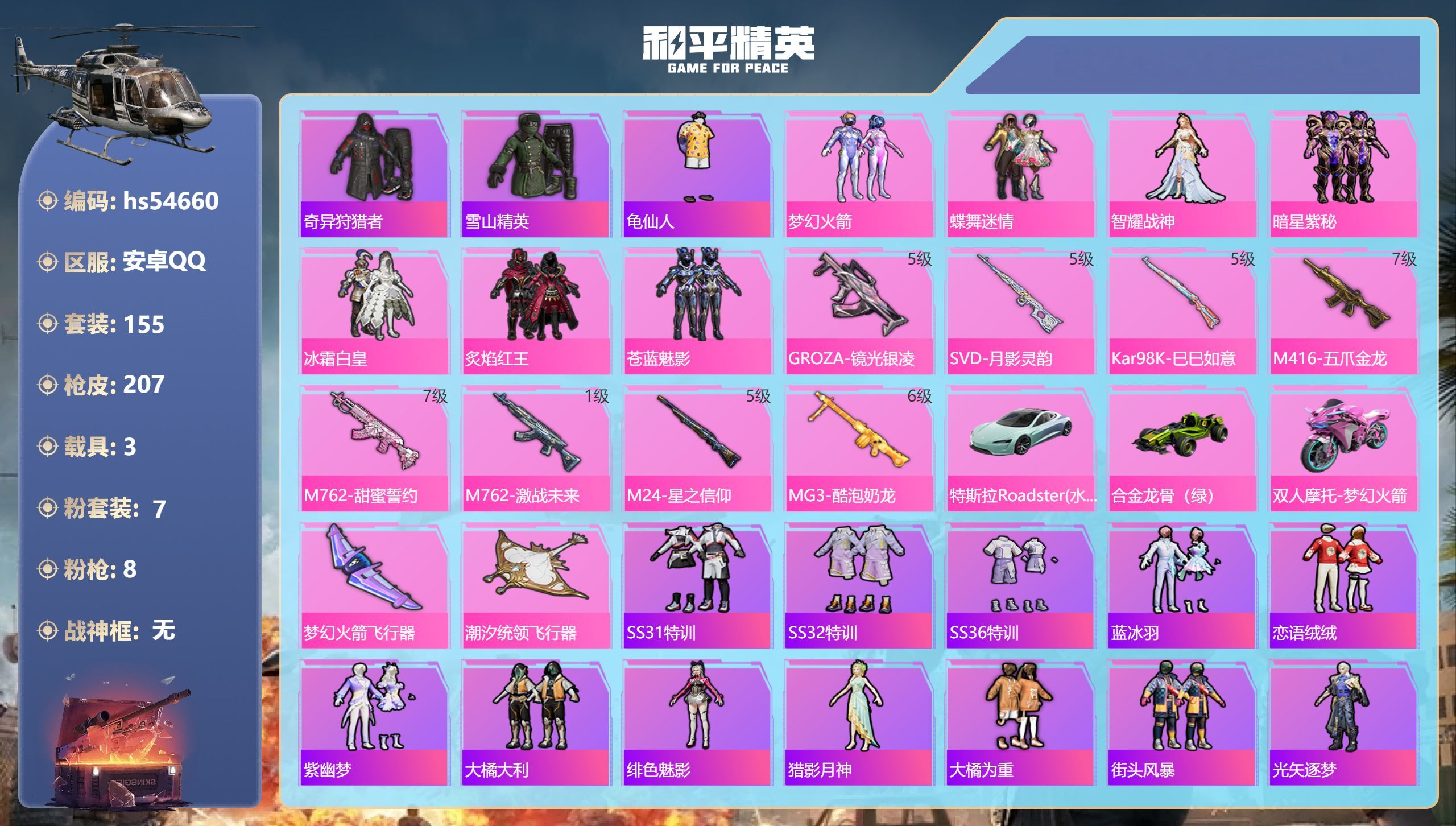 hs54660 安卓手Q-15王牌印记-7粉装-8特效枪-3载具-74814热力值-155套装-20