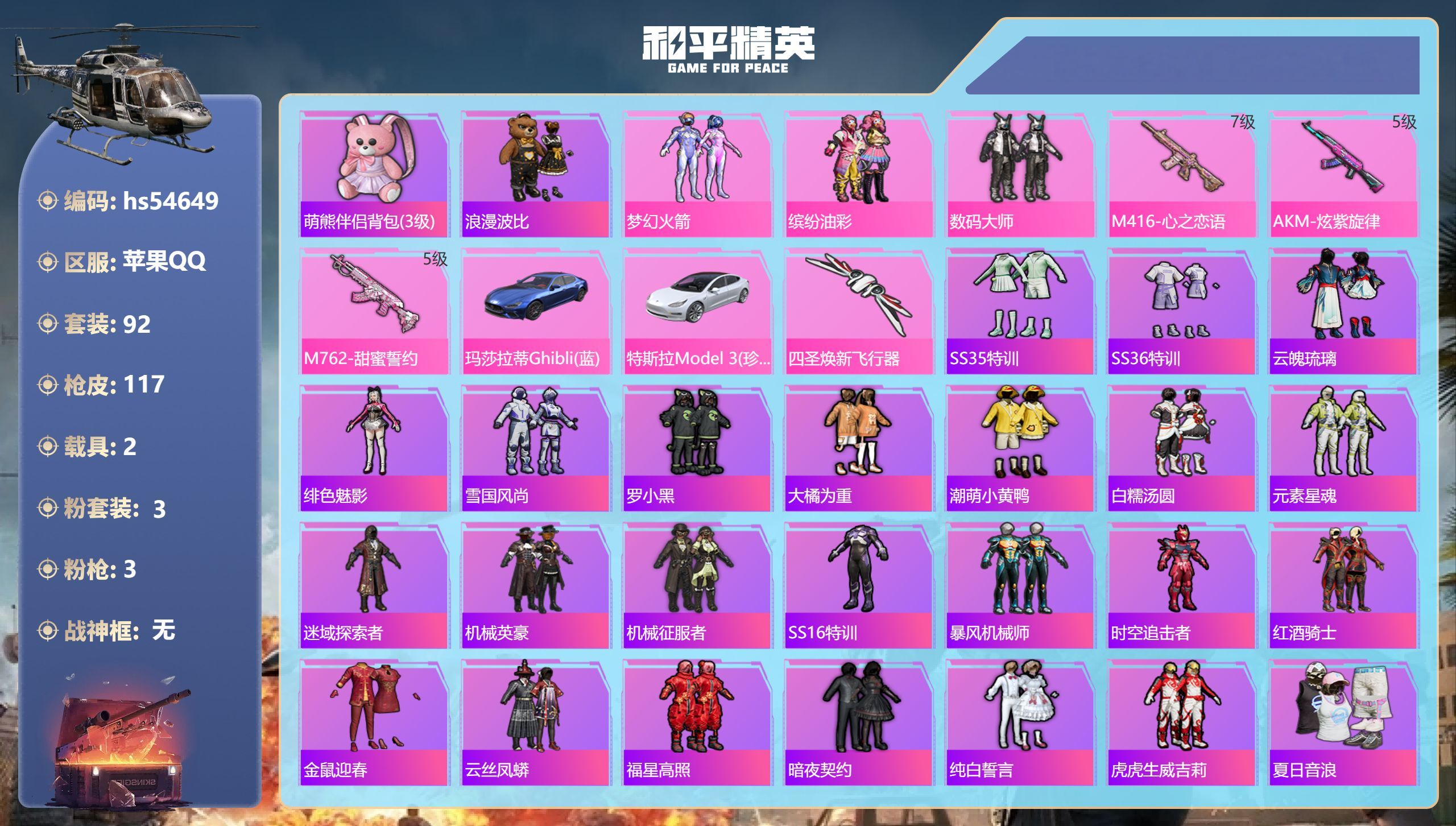 hs55011 苹果v-24王牌印记-有战神框-7粉装-10特效枪-2载具-106079热力值-2