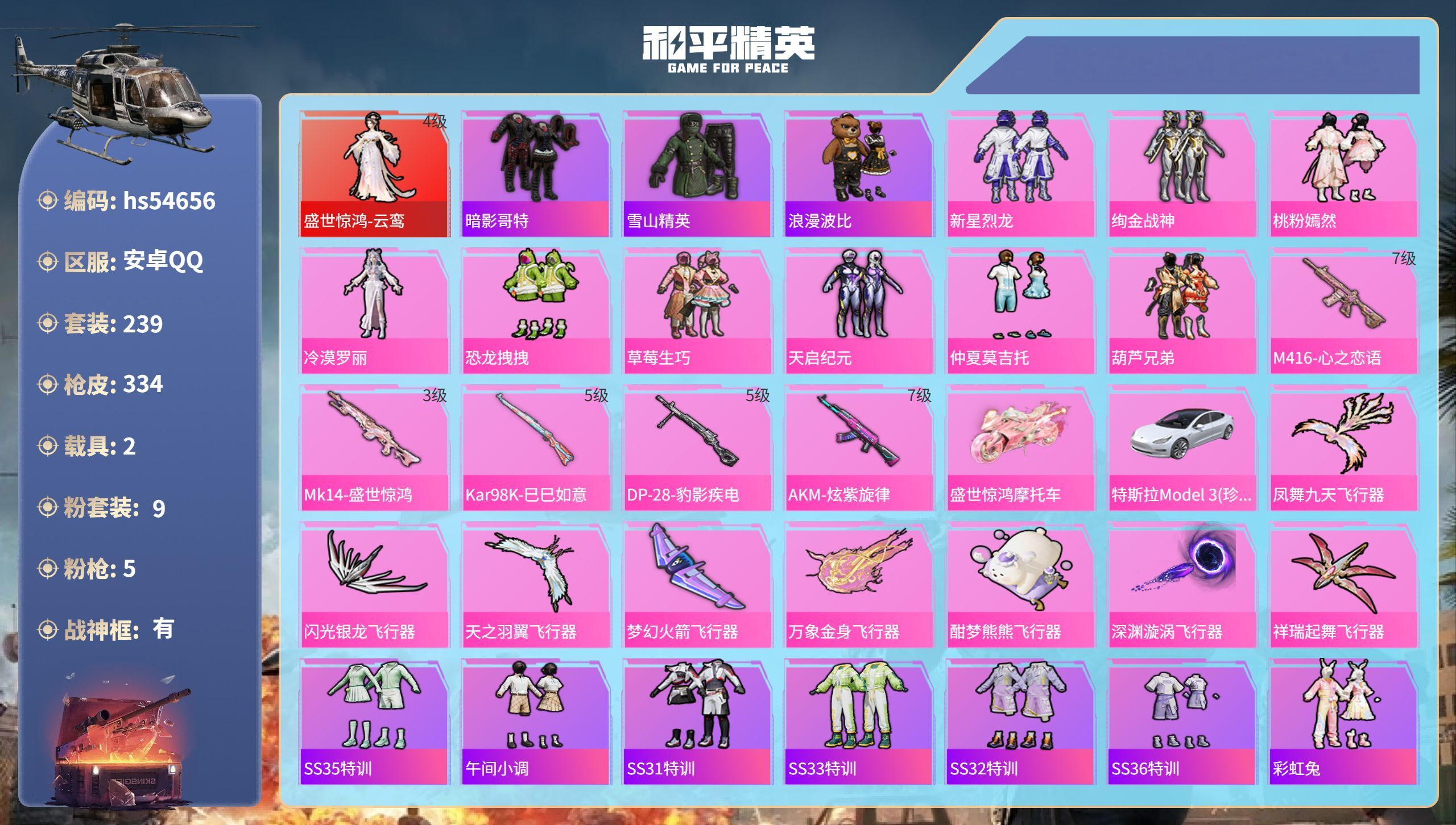 a4113/安卓QQ/-8王牌印记-16粉装-9特效枪-2载具-85879热力值-168套装-240