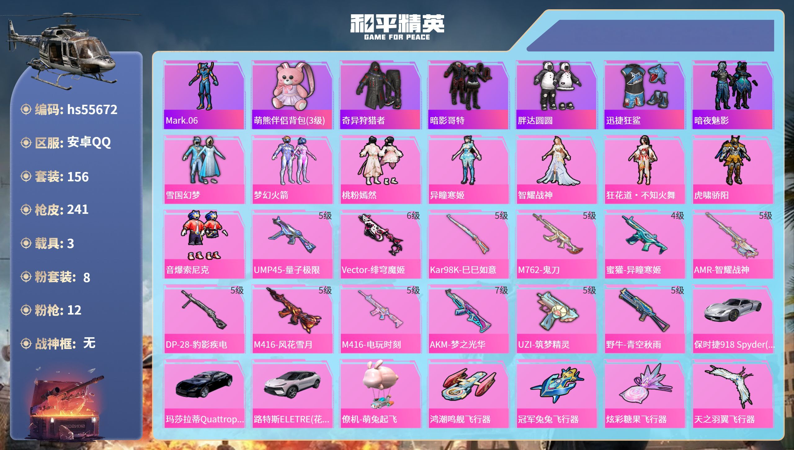 hs55672 安卓手Q-16王牌印记-8粉装-12特效枪-3载具-82600热力值-156套装-2