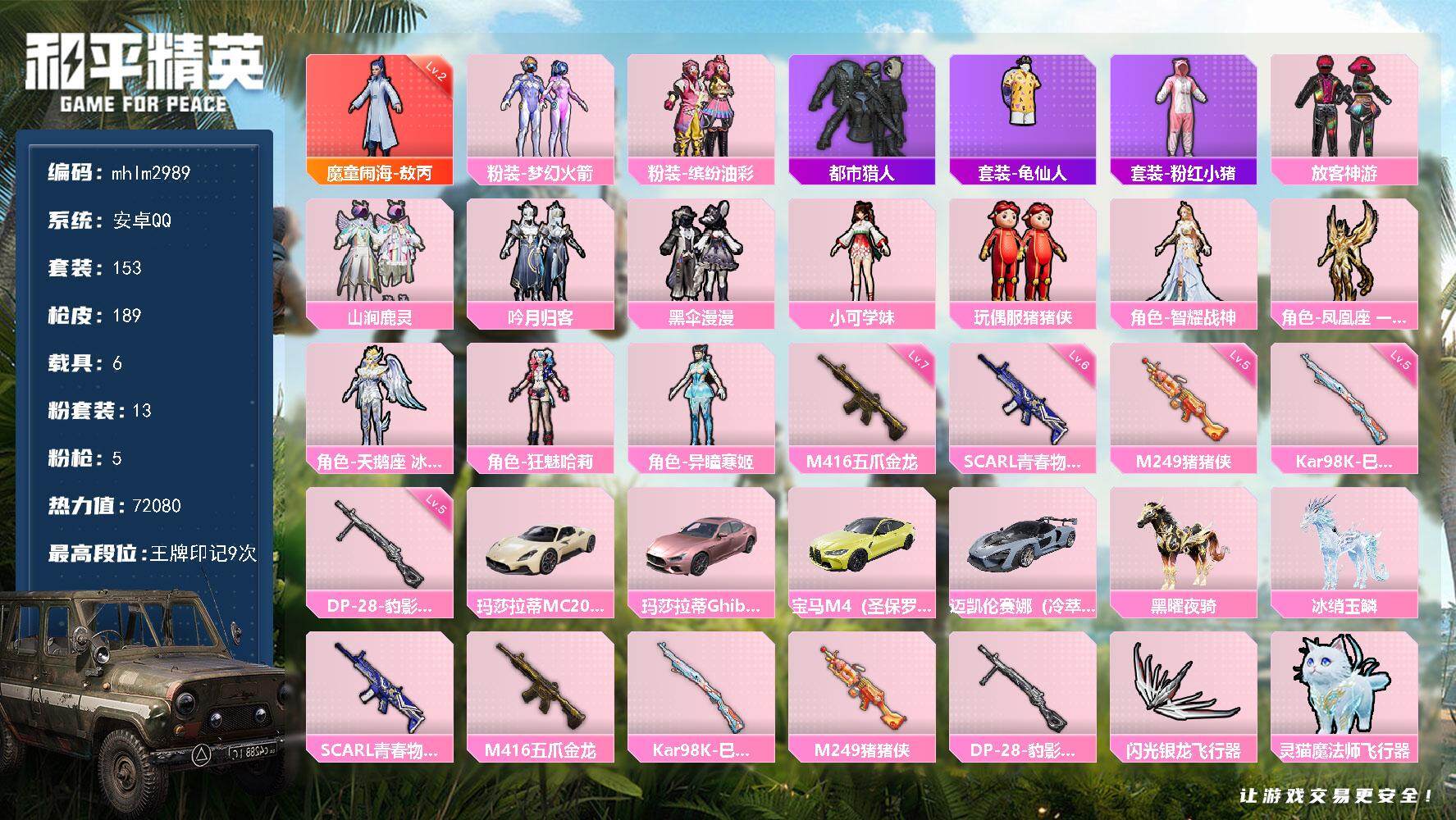 【mhlm2989】安卓 手Q-1神装-13粉装-5特效枪-6载具-6粉色飞行