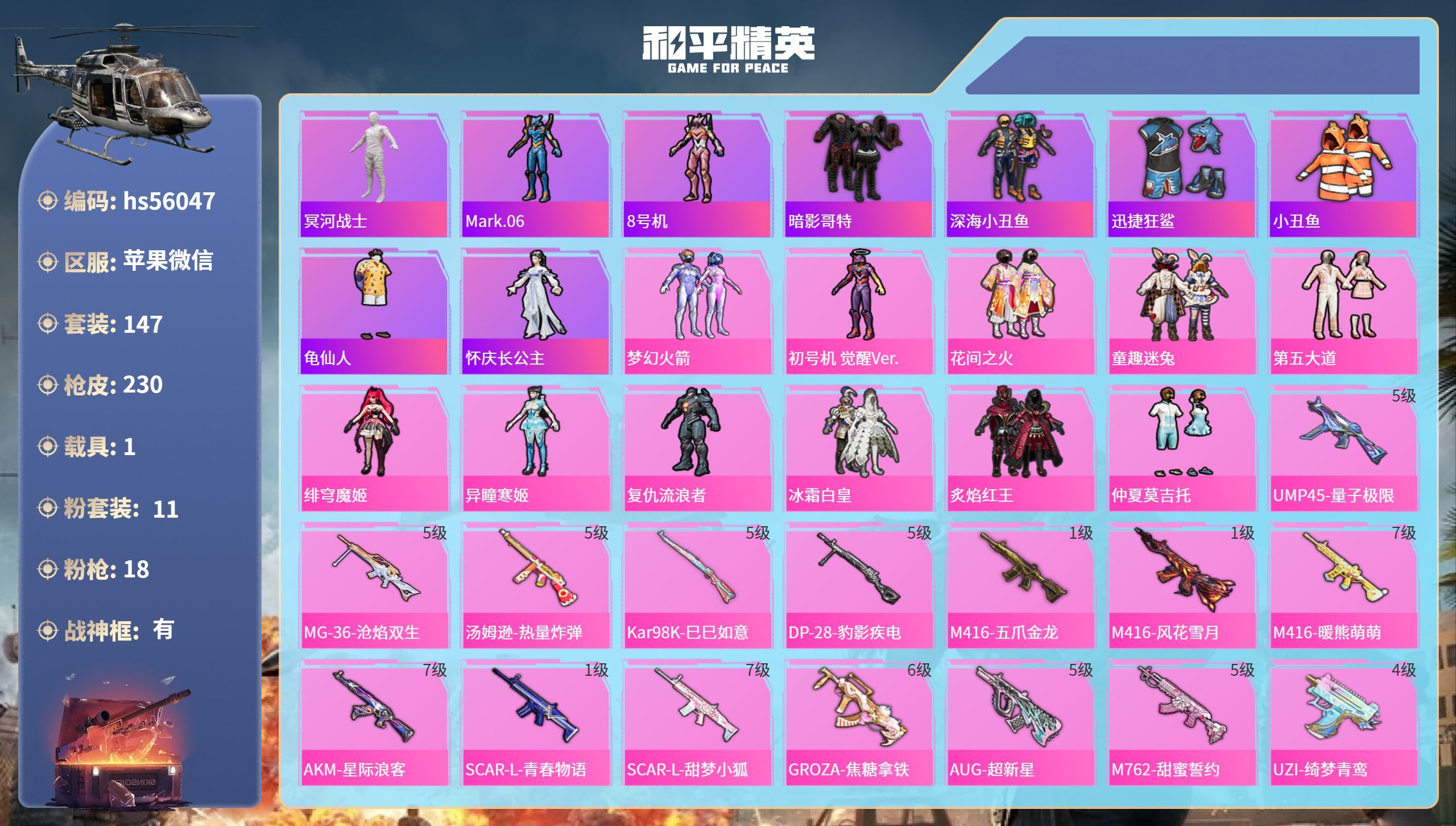 hs56047 苹果v-12王牌印记-有战神框-11粉装-18特效枪-1载具-78269热力值-1