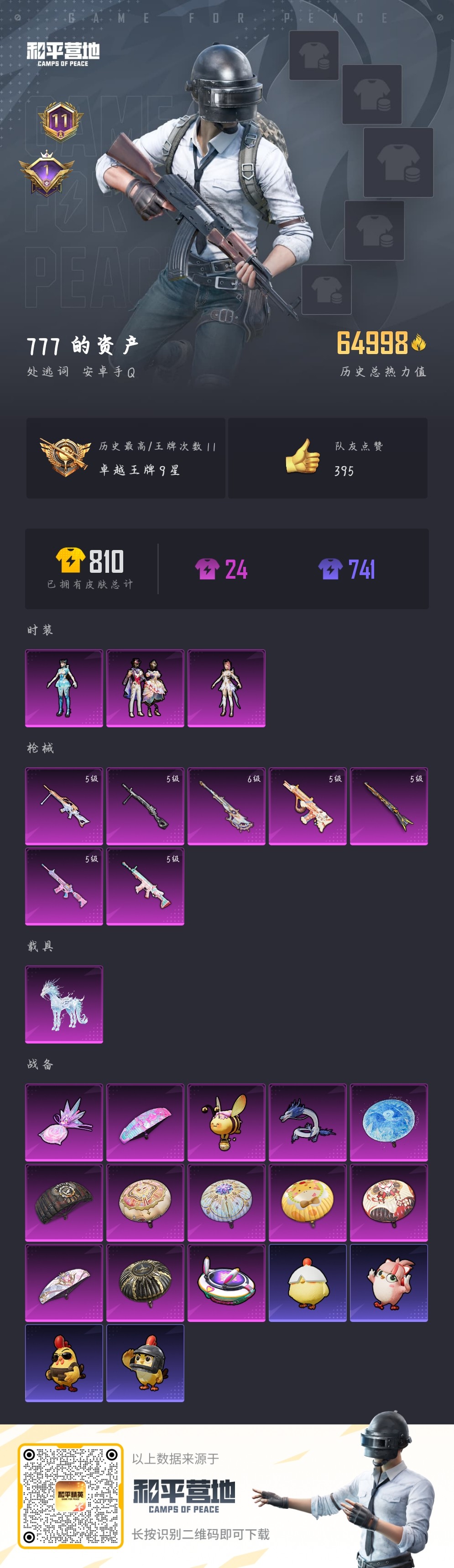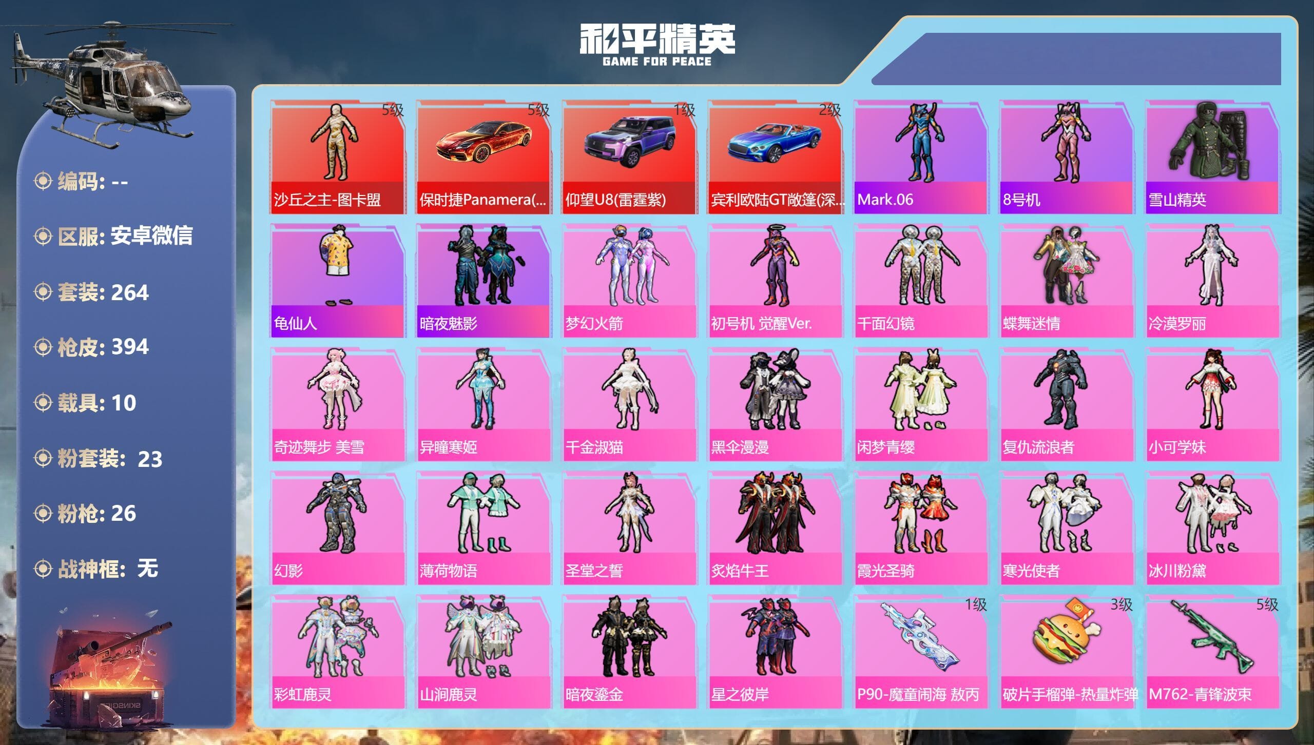 s18/安卓v/-26王牌印记-1红装-23粉装-26特效枪-10载具-159074热力值-264