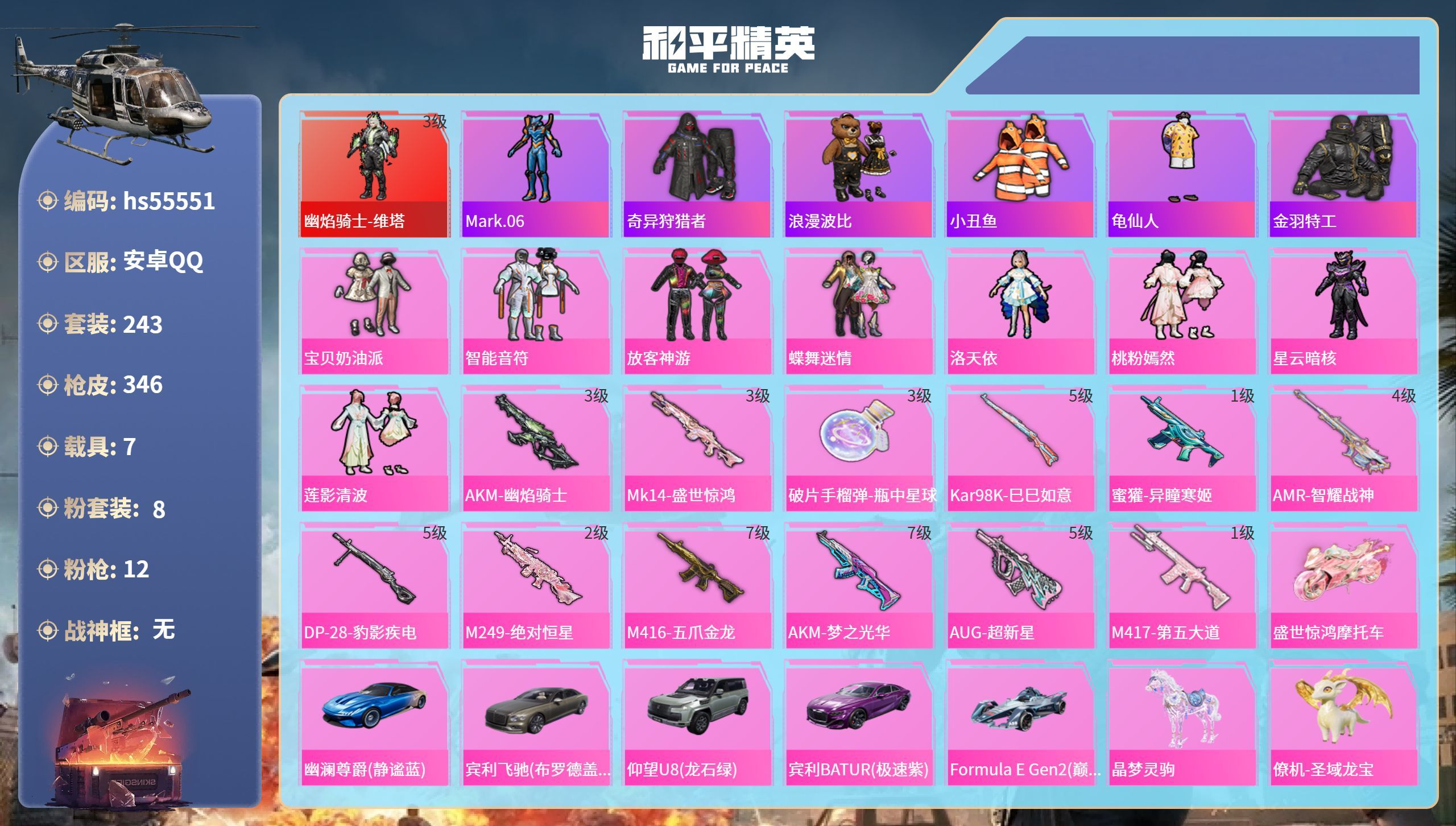 hs55551 安卓手Q-19王牌印记-1红装-8粉装-12特效枪-7载具-117671热力值-24