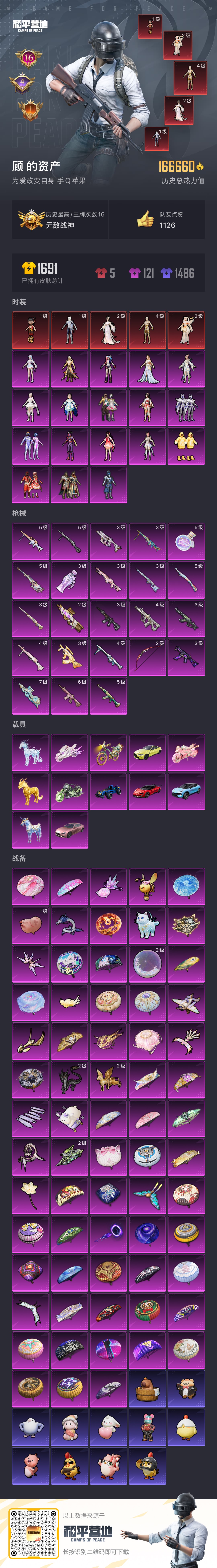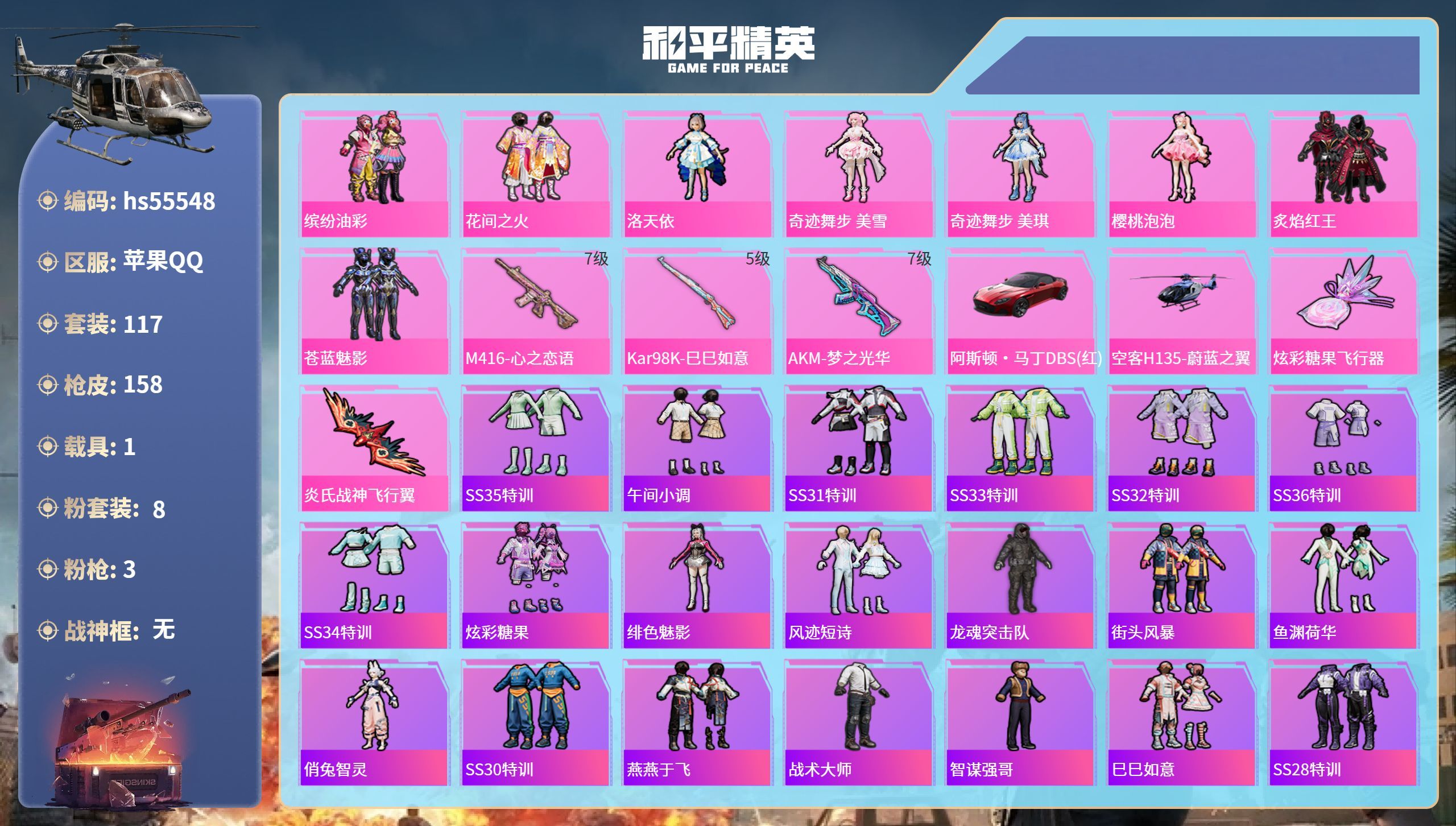 hs55548 苹果手Q-11王牌印记-8粉装-3特效枪-1载具-50996热力值-117套装-15