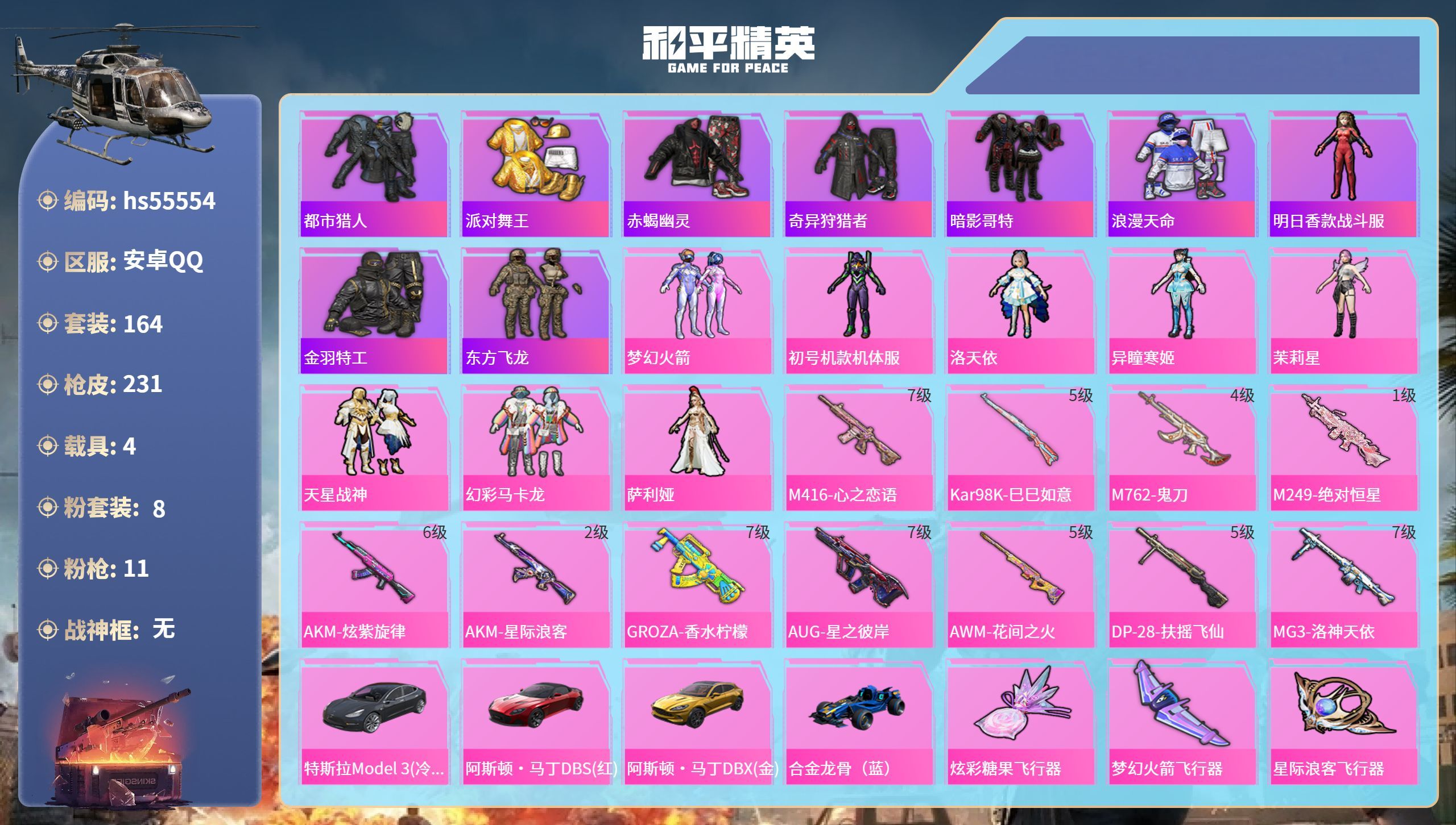 hs55554 安卓手Q-14王牌印记-8粉装-11特效枪-4载具-83133热力值-164套装-2