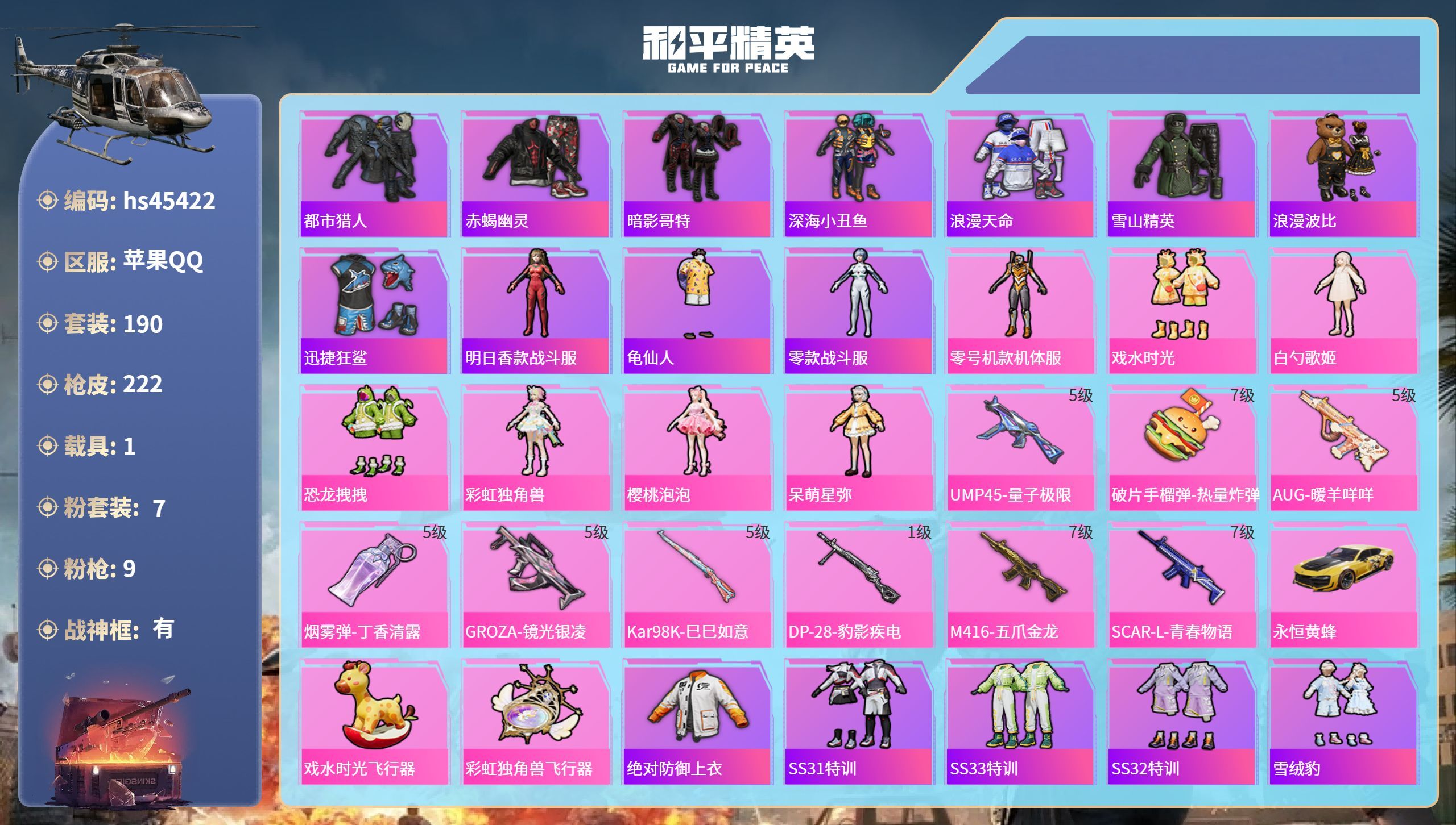 hs45422 苹果手Q-24王牌印记-有战神框-7粉装-9特效枪-1载具-72740热力值-190