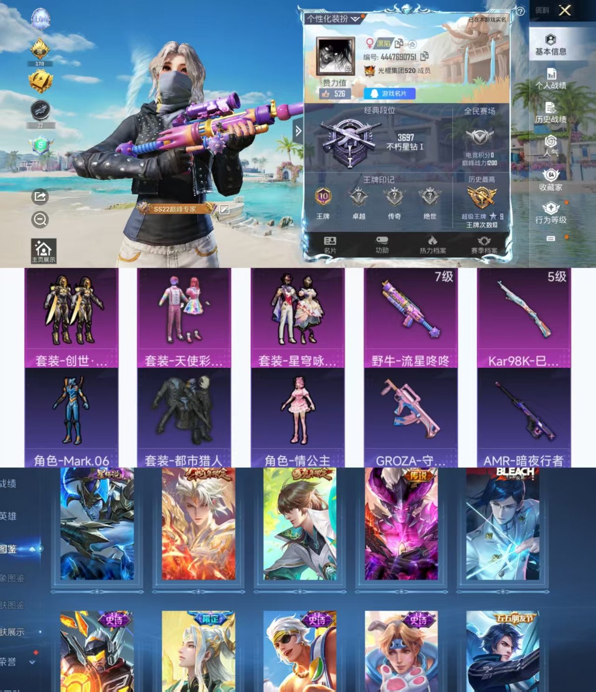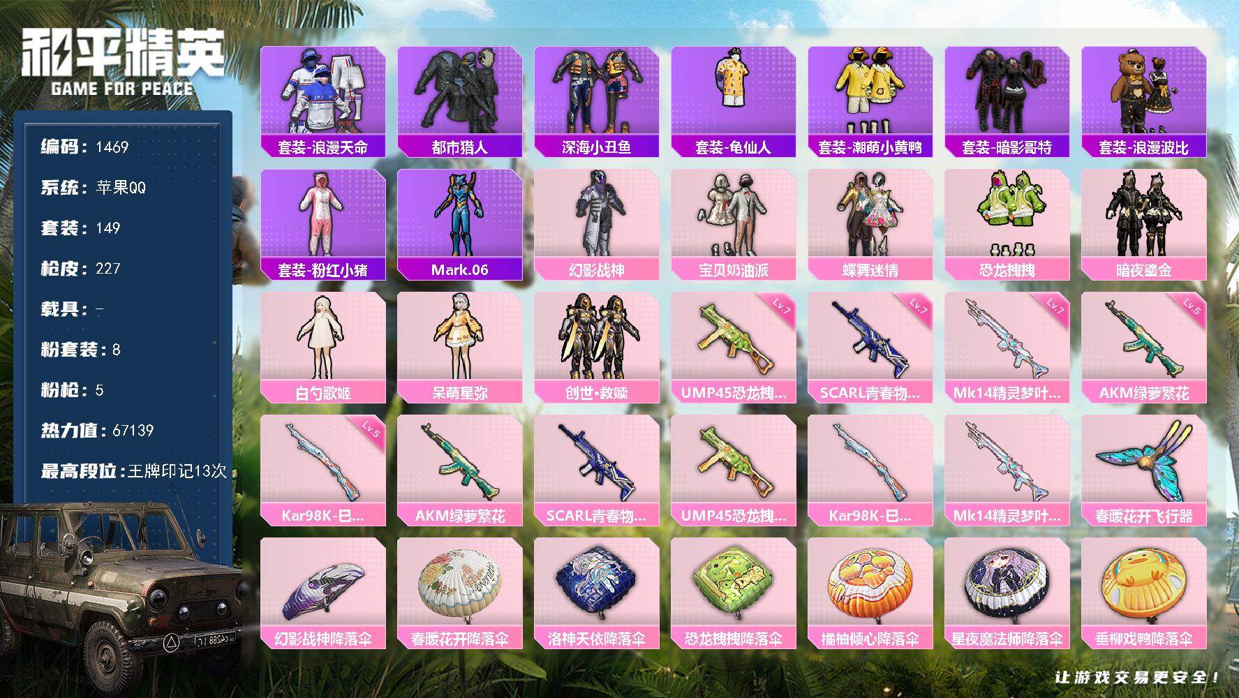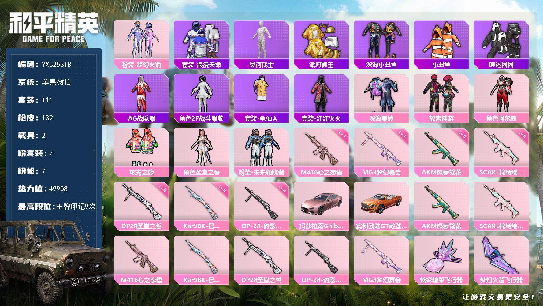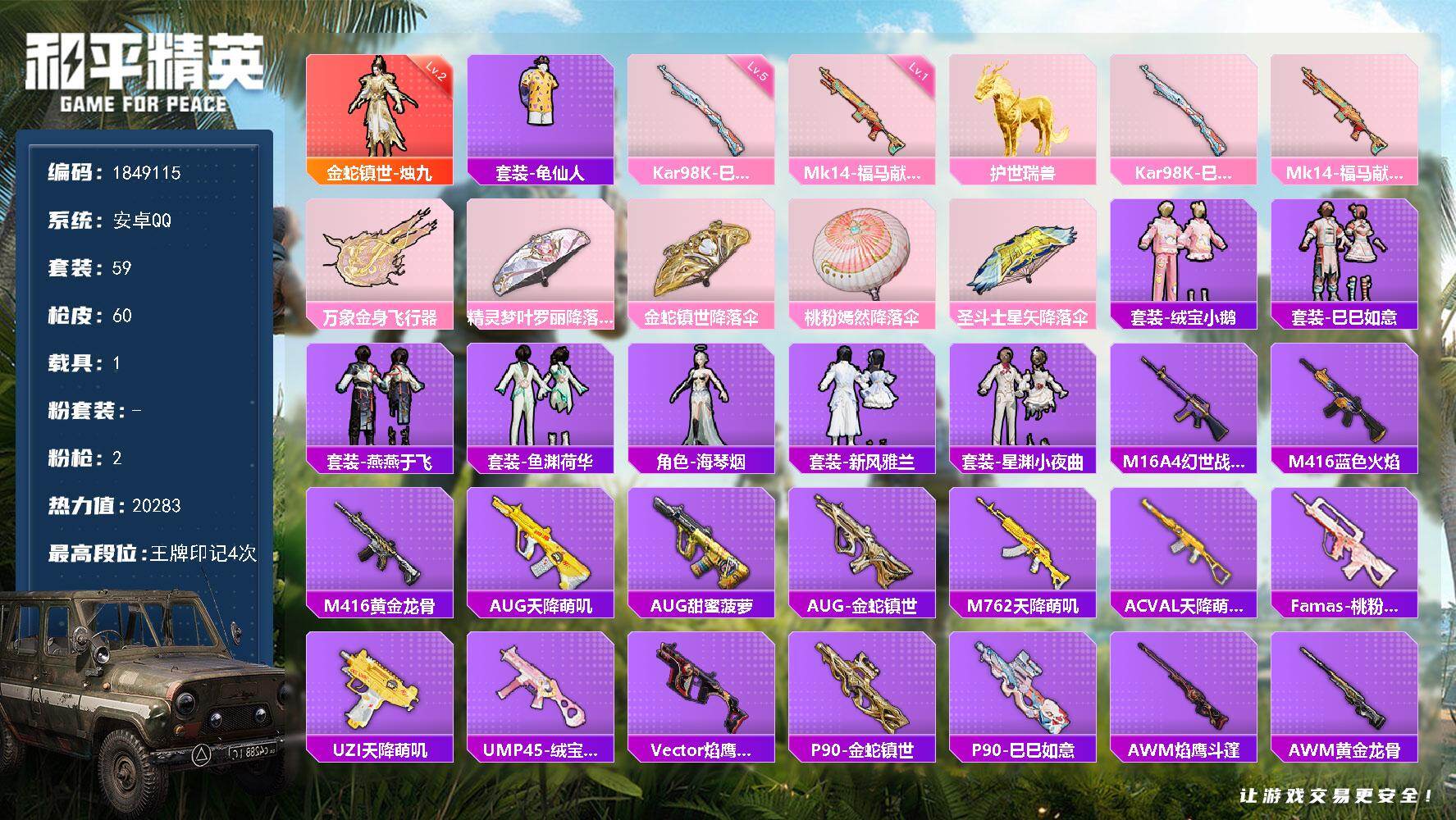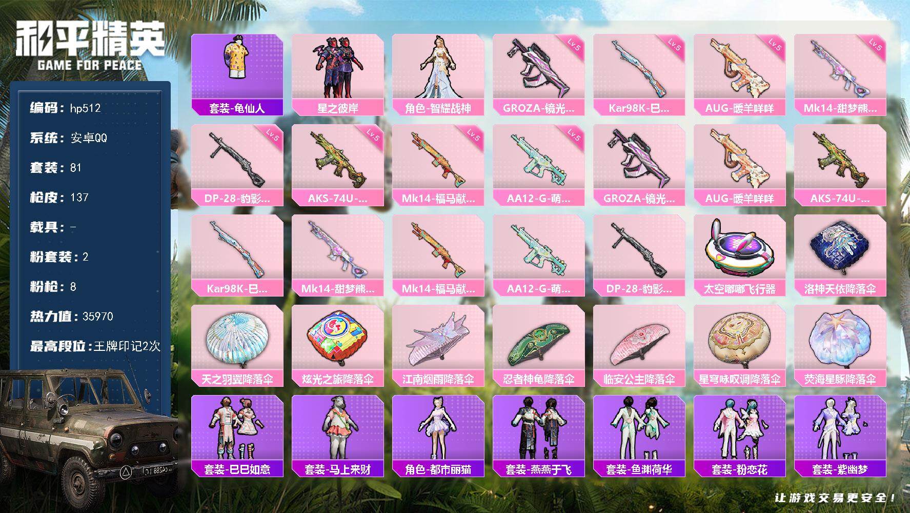 a4302/安卓QQ/0王牌印记-7粉装-4特效枪-4载具-24323热力值-39套装-53枪皮
