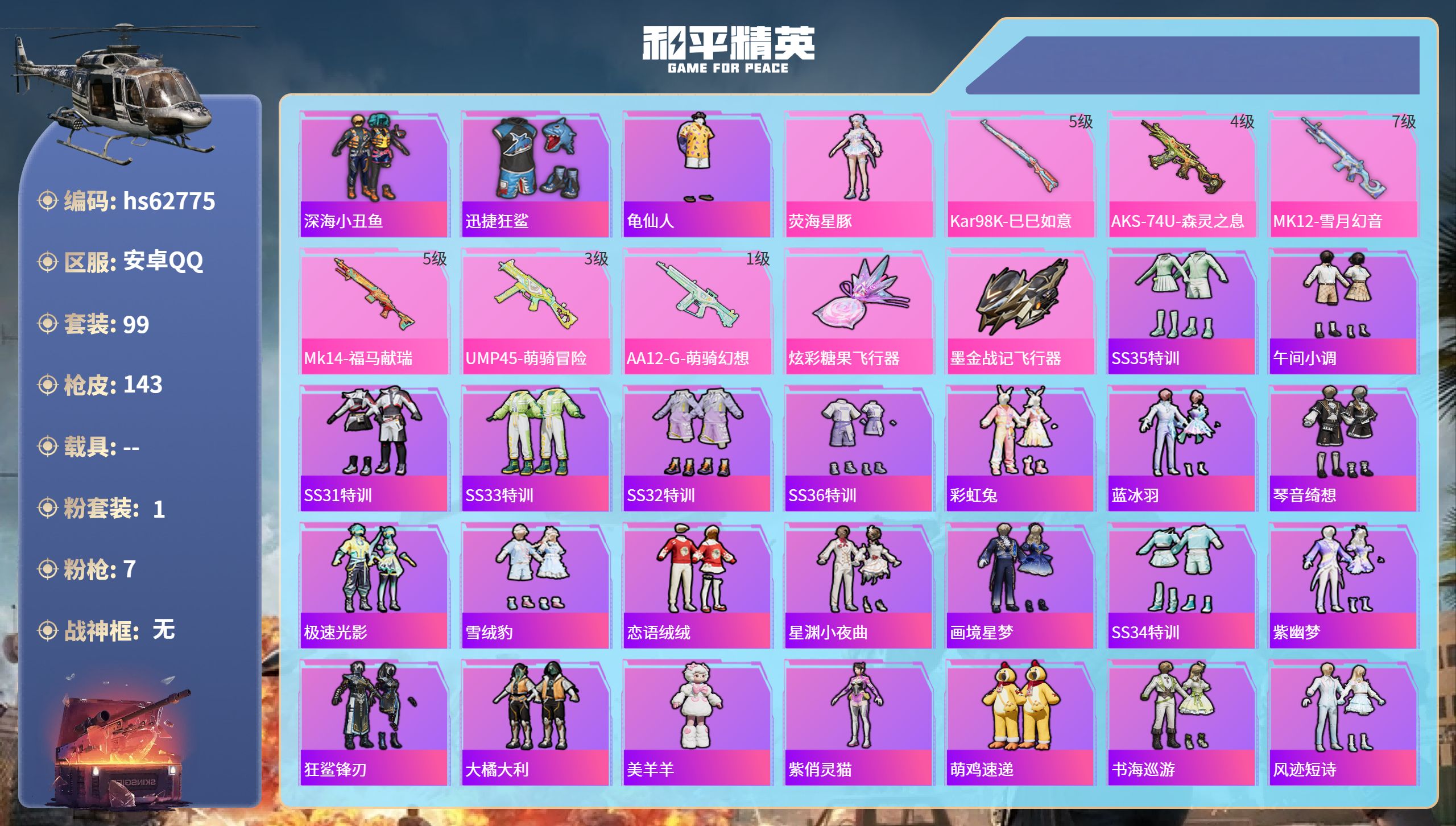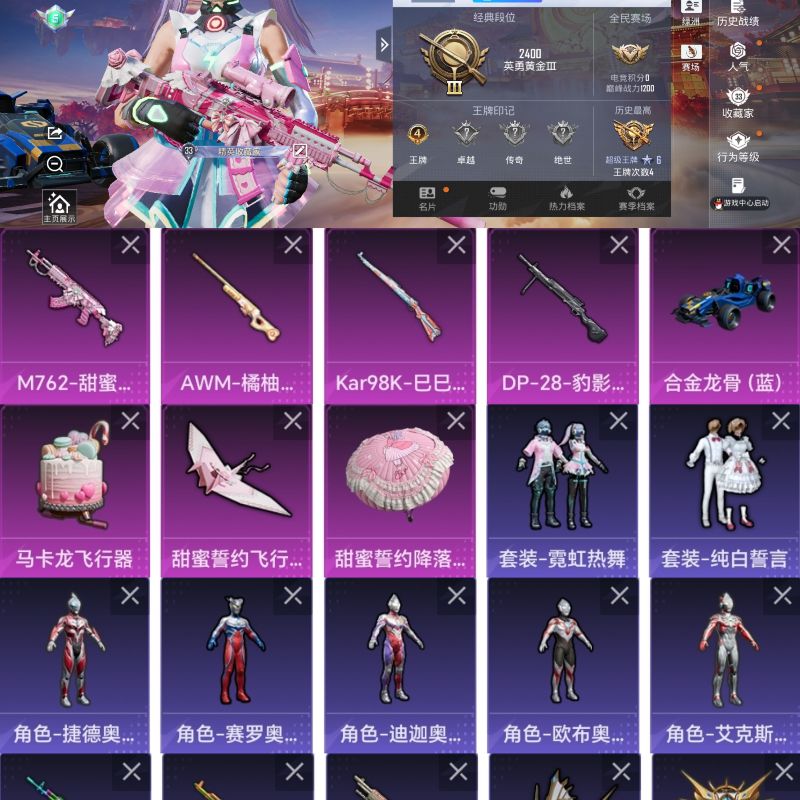 7粉装-6特效枪-2载具-2粉色飞行器-89606热力值-11王牌印记-193套装-300枪皮