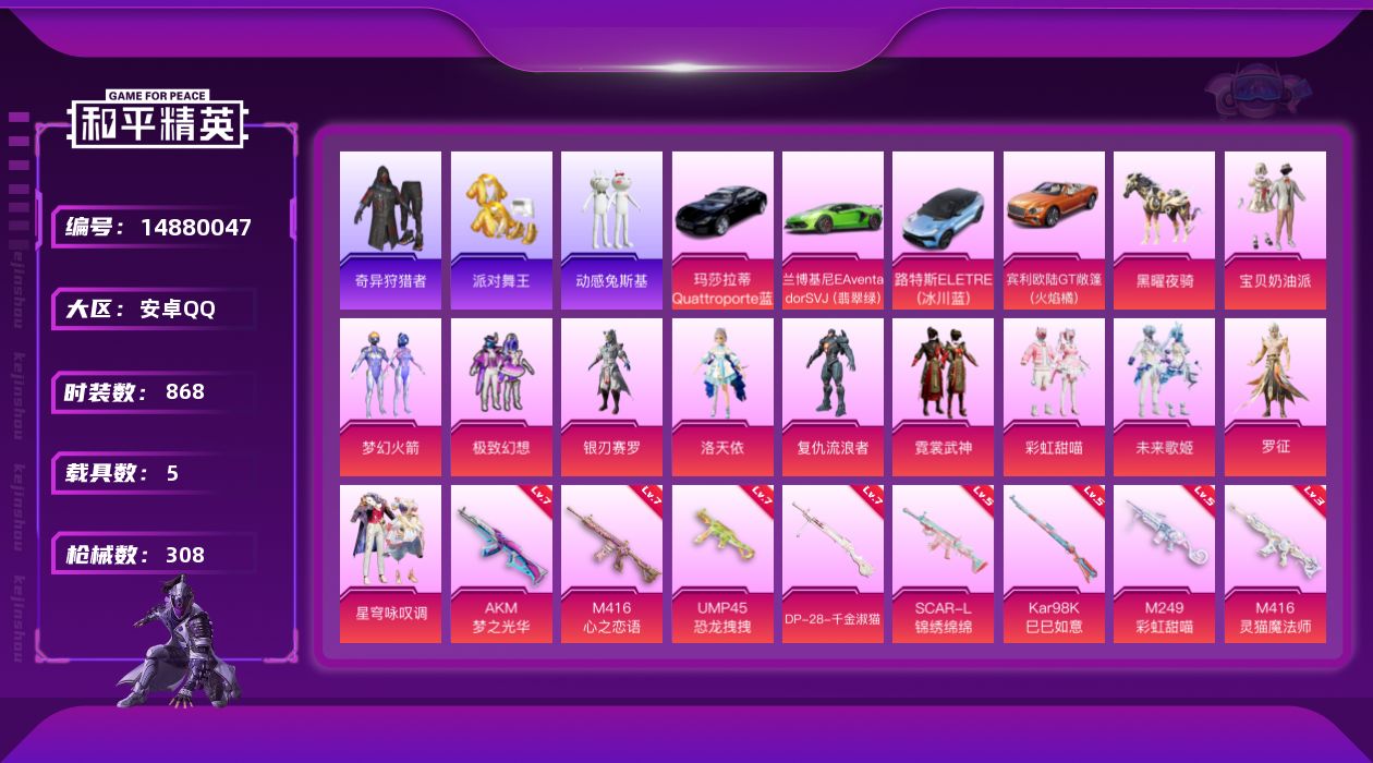 10粉装 5特效枪 3载具 7印记 可二次 可修改实名 时装数:500 枪械数:173 战备数:3