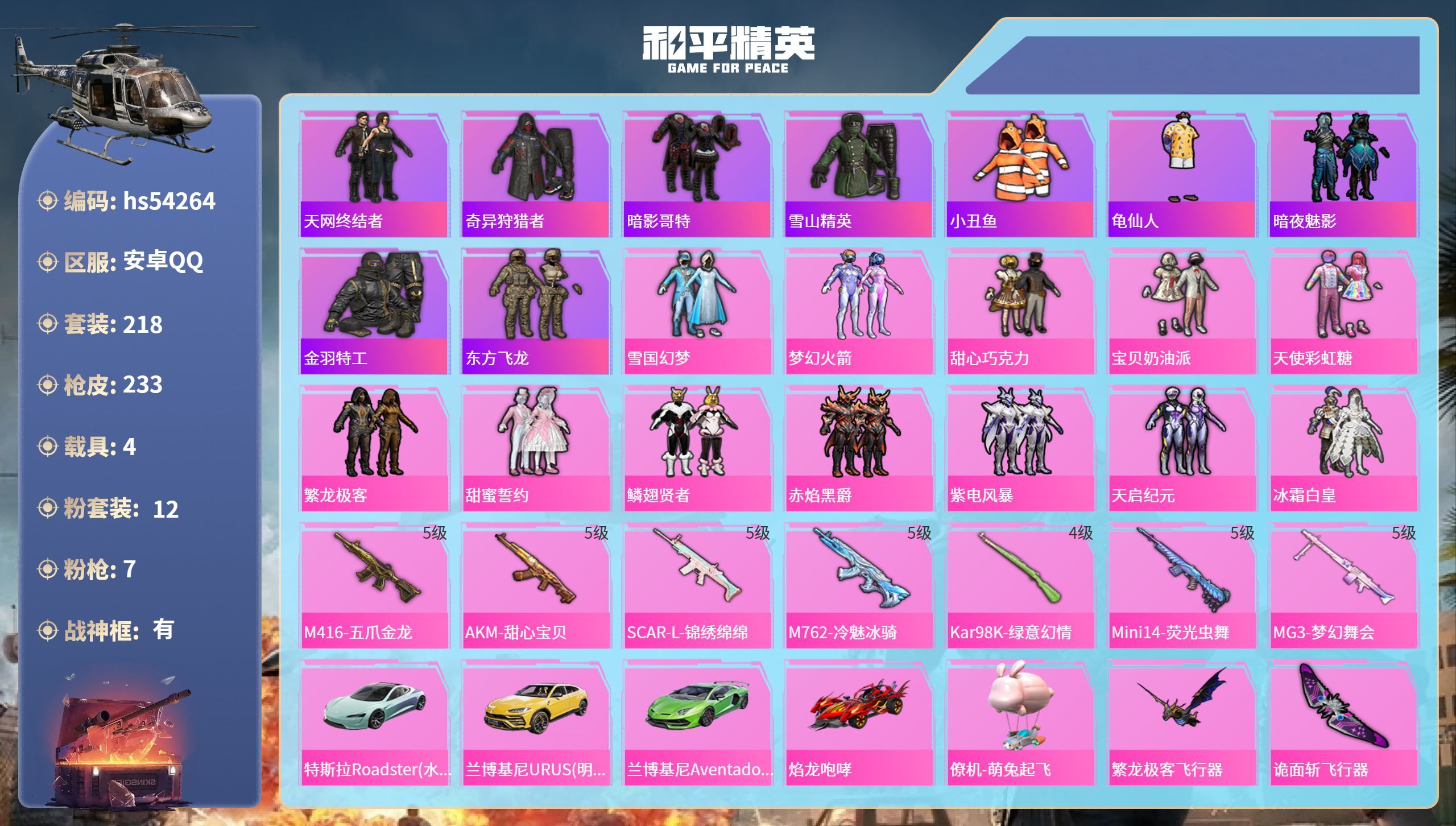 hs54264 安卓手Q-23王牌印记-有战神框-12粉装-7特效枪-4载具-87095热力值-21