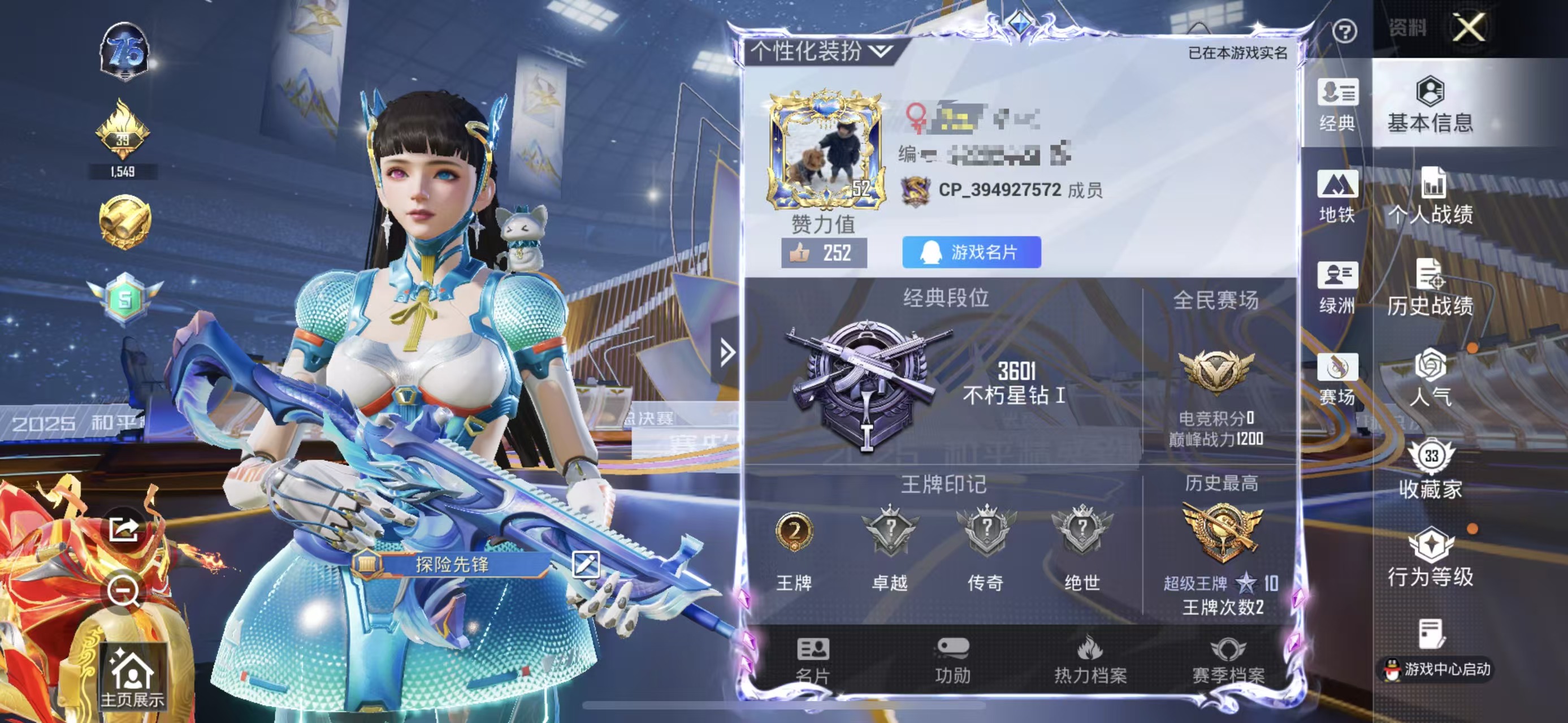 历史总热力值:91413 粉装数量:6 特效枪数量:16 载具数量:2 王牌印记:9 历史最高段位:卓越王牌7星 套装数量:173 时装数量:637 枪械数量:272 战备数量:192 装备数量:374