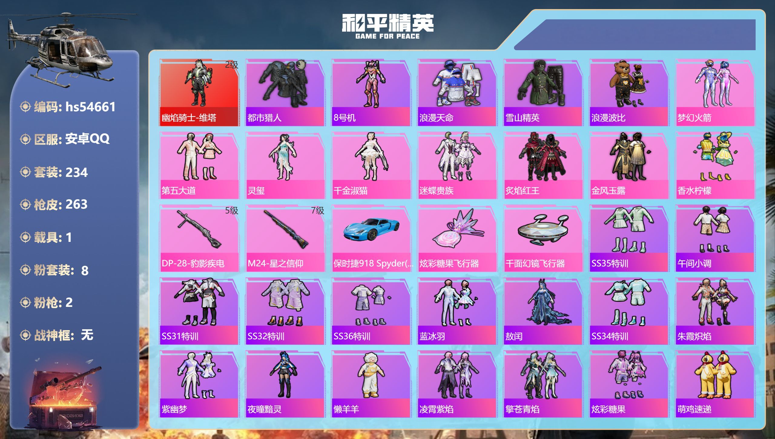 hs54650 安卓手Q-10王牌印记-7粉装-8特效枪-1载具-49586热力值-129套装-13