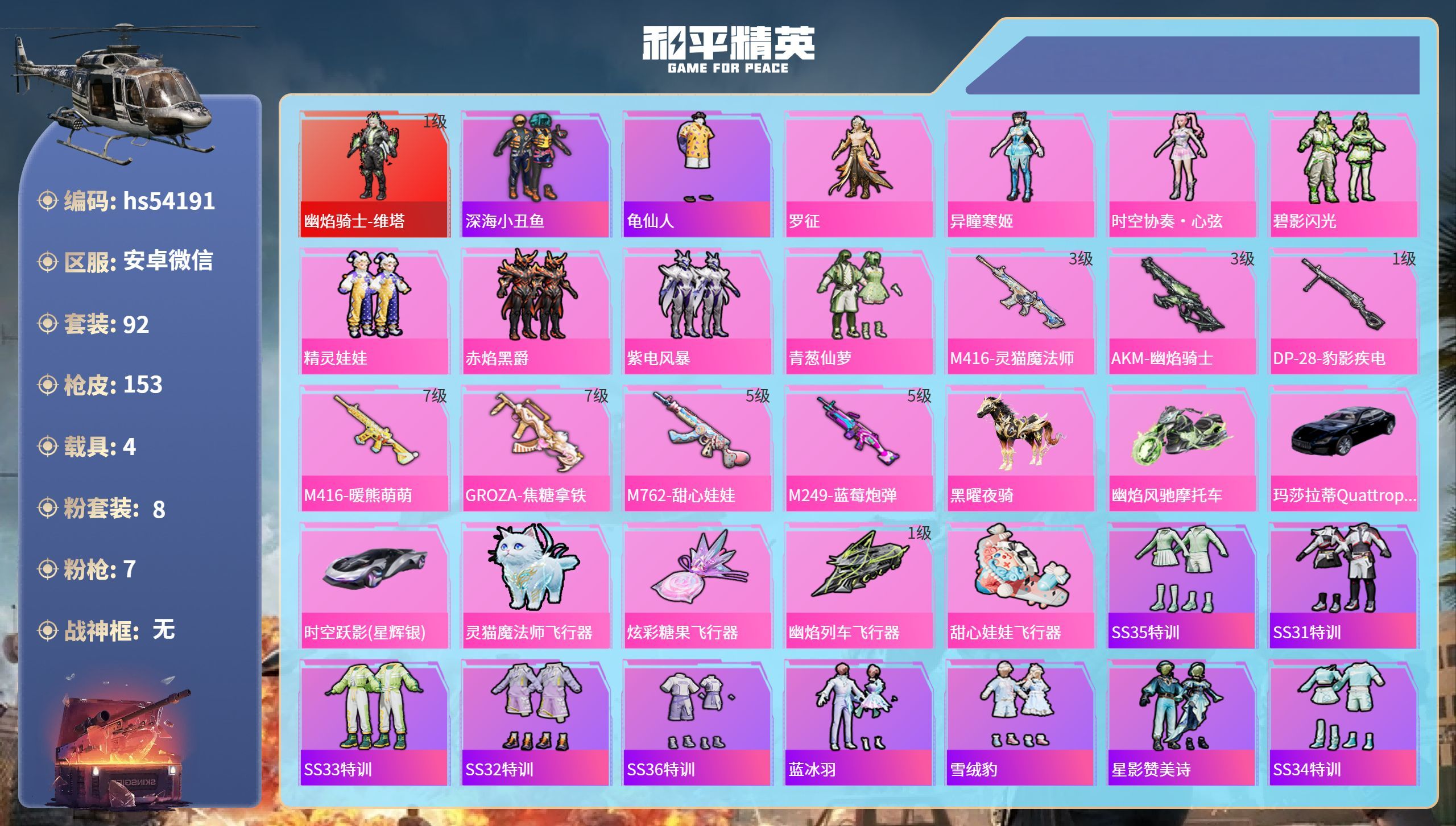 hs54159 安卓手Q-7王牌印记-5粉装-1特效枪-1载具-46829热力值-111套装-151