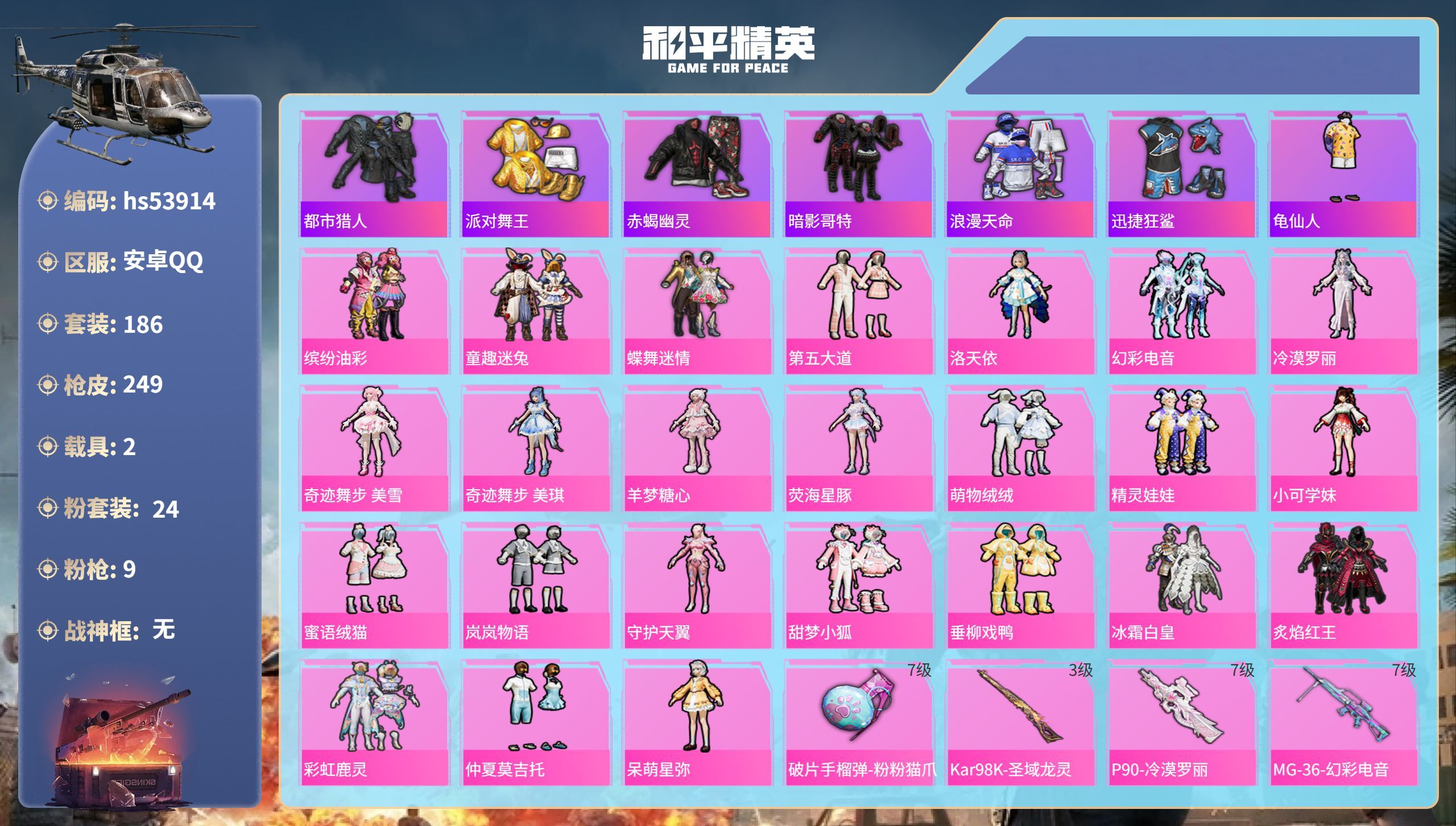 hs53914 安卓手Q-11王牌印记-24粉装-9特效枪-2载具-热力值-186套装-2