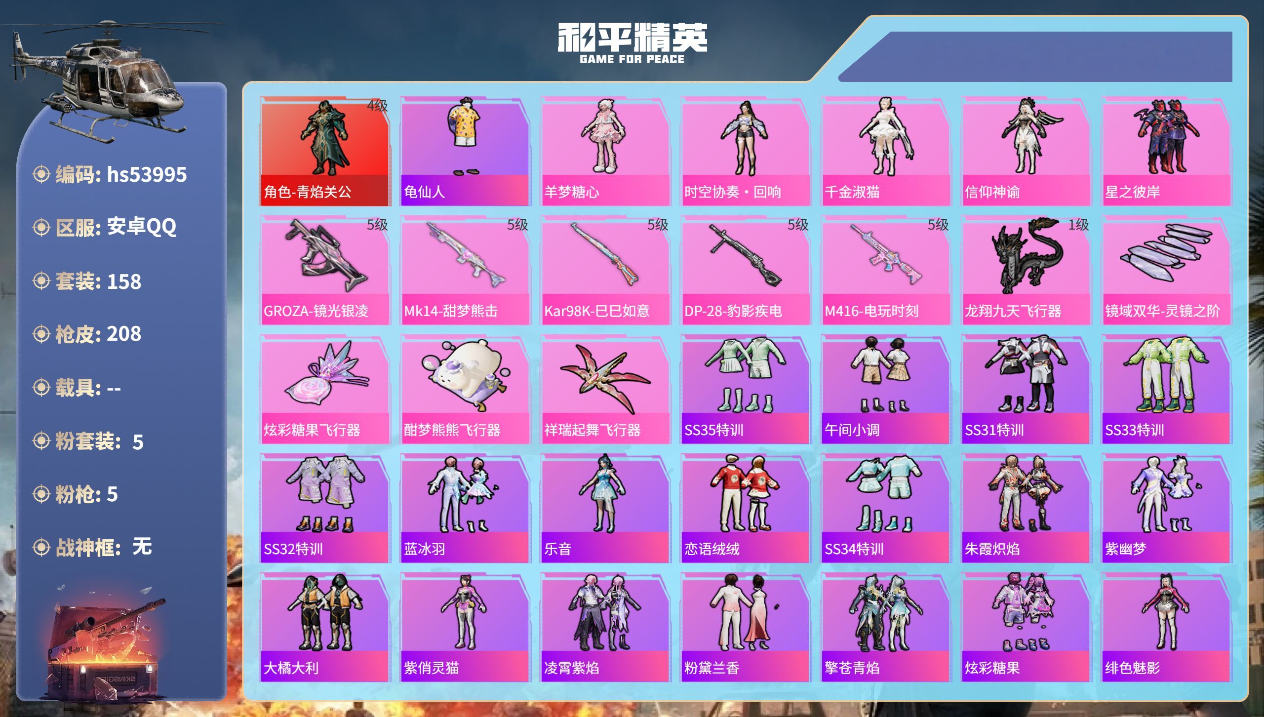 hs53995 安卓手Q-12王牌印记-1红装-5粉装-5特效枪-65637热力值-158套装-20