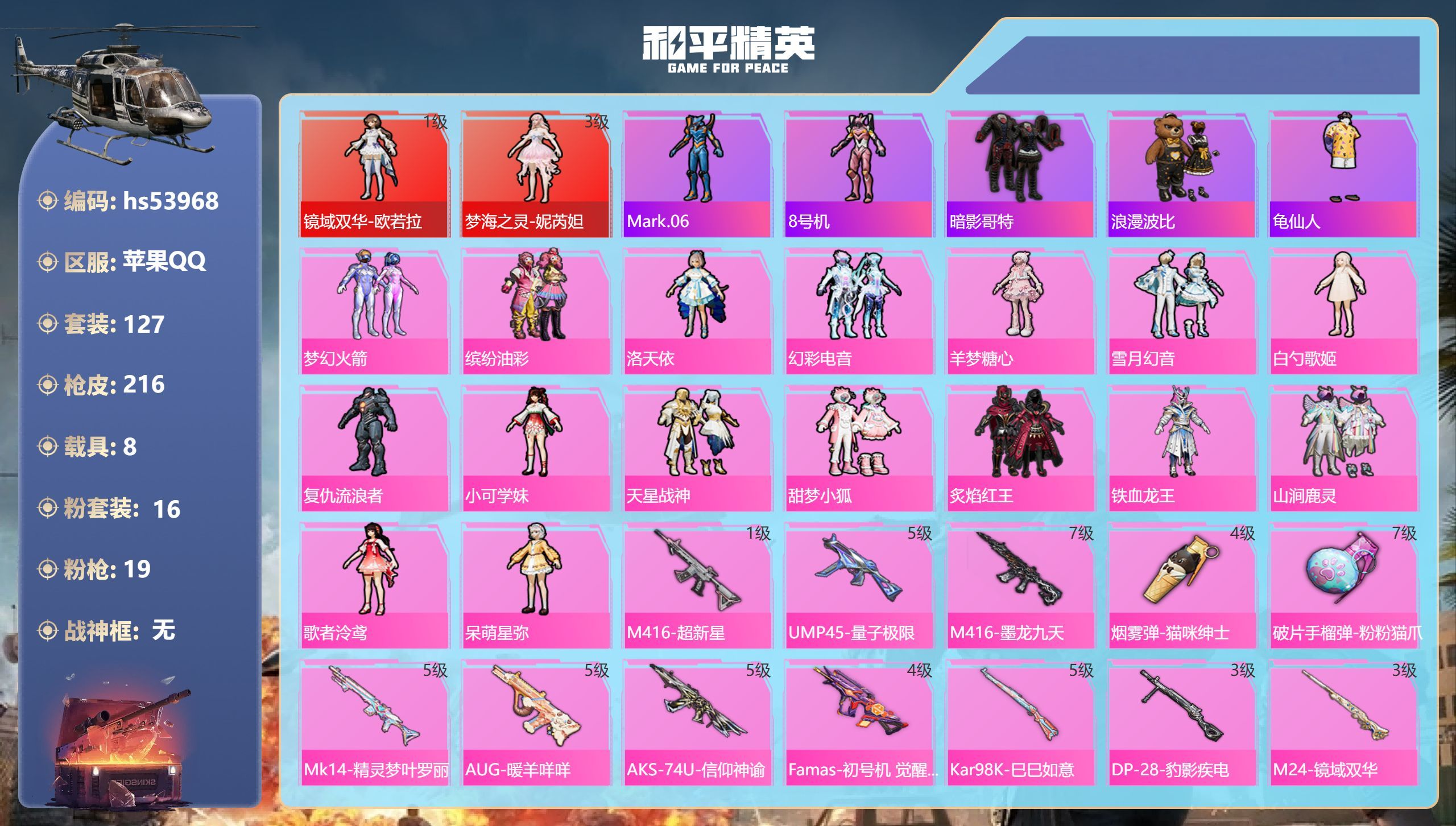 hs53968 苹果手Q-8王牌印记-2红装-16粉装-19特效枪-8载具-87034热力值-127