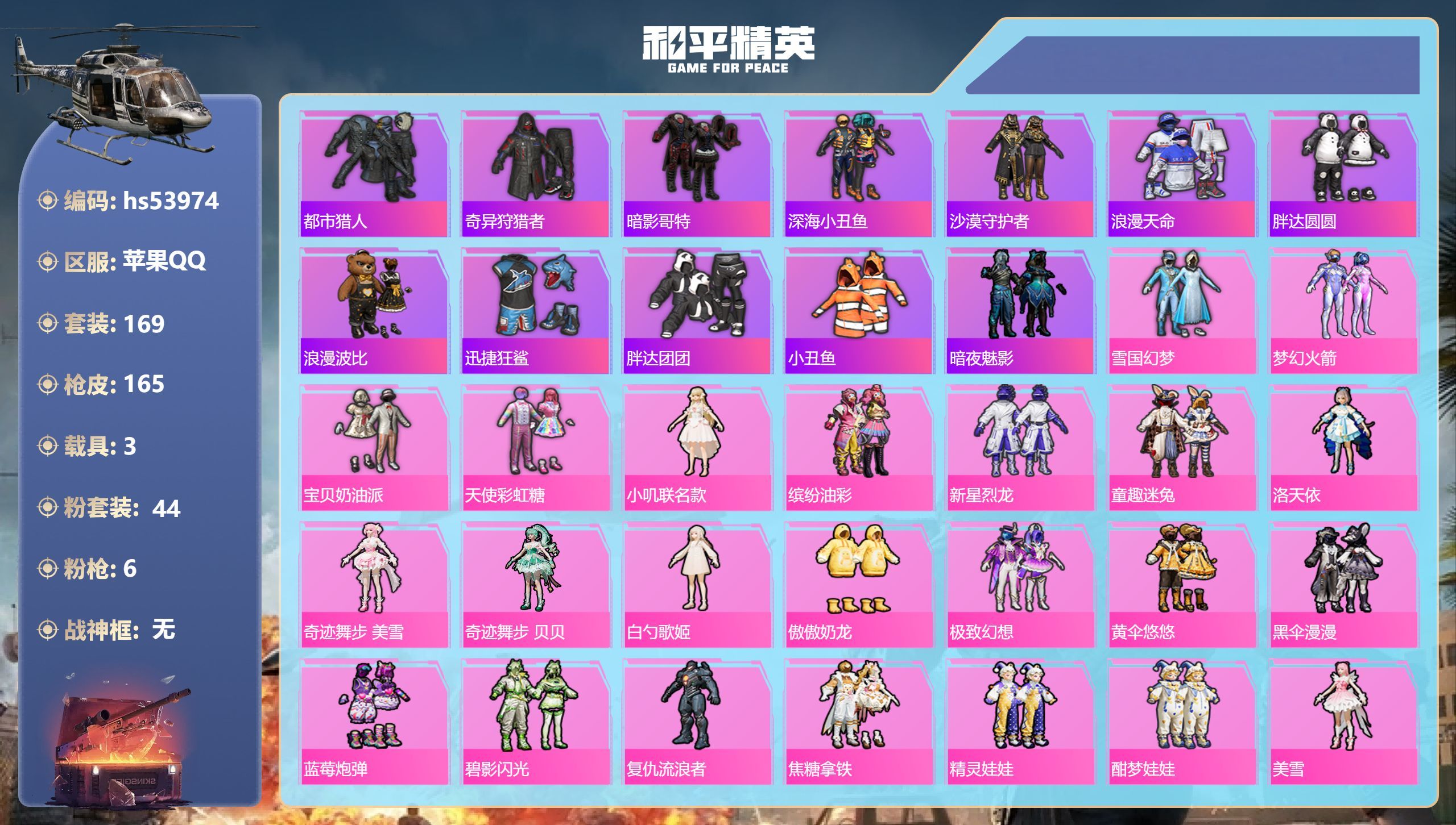 苹果手Q-10王牌印记-44粉装-6特效枪-3载具-77319热力值-169套装-165枪皮-1卓越