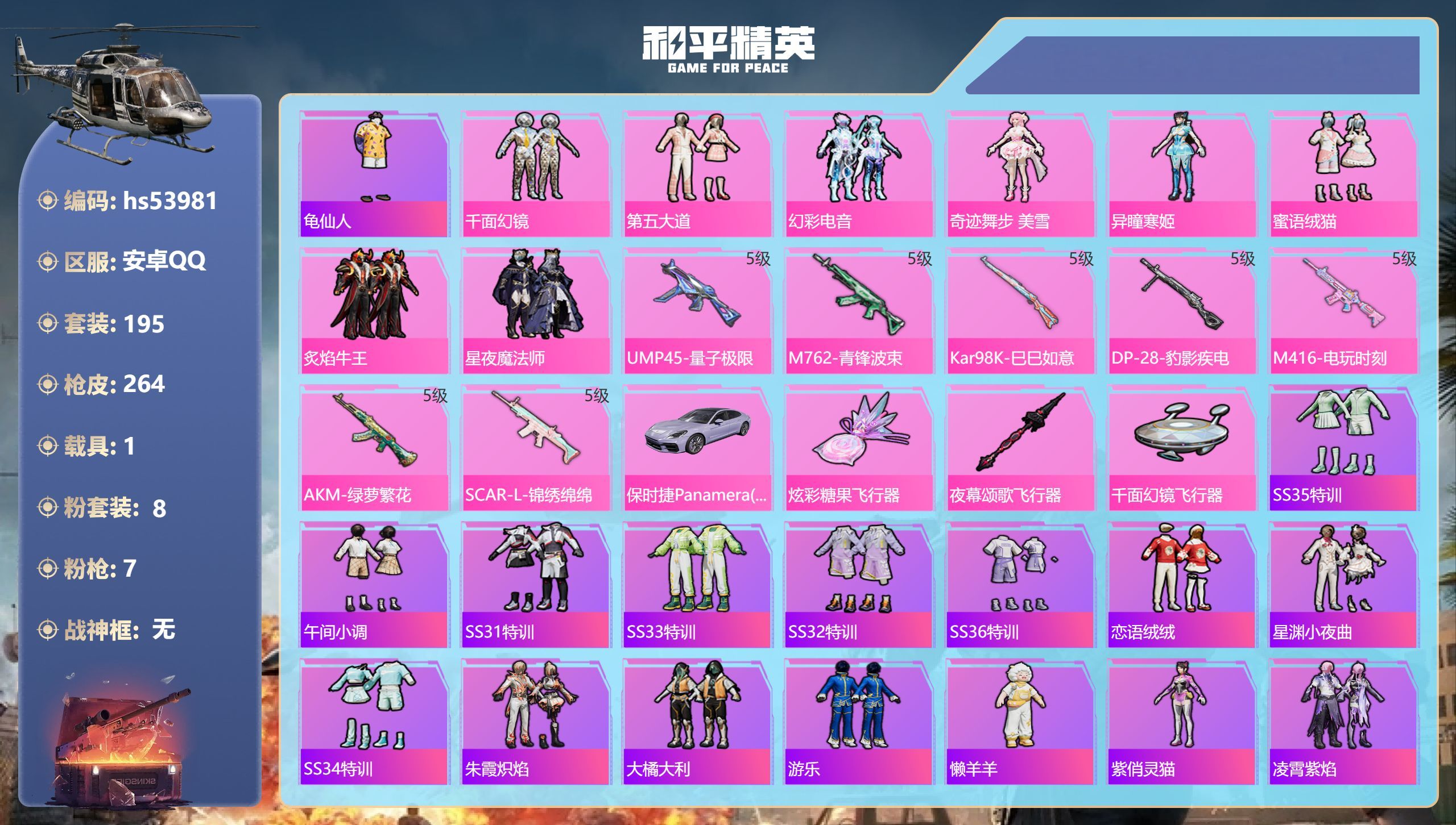 hs53981 安卓手Q-19王牌印记-8粉装-7特效枪-1载具-88681热力值-195套装-26