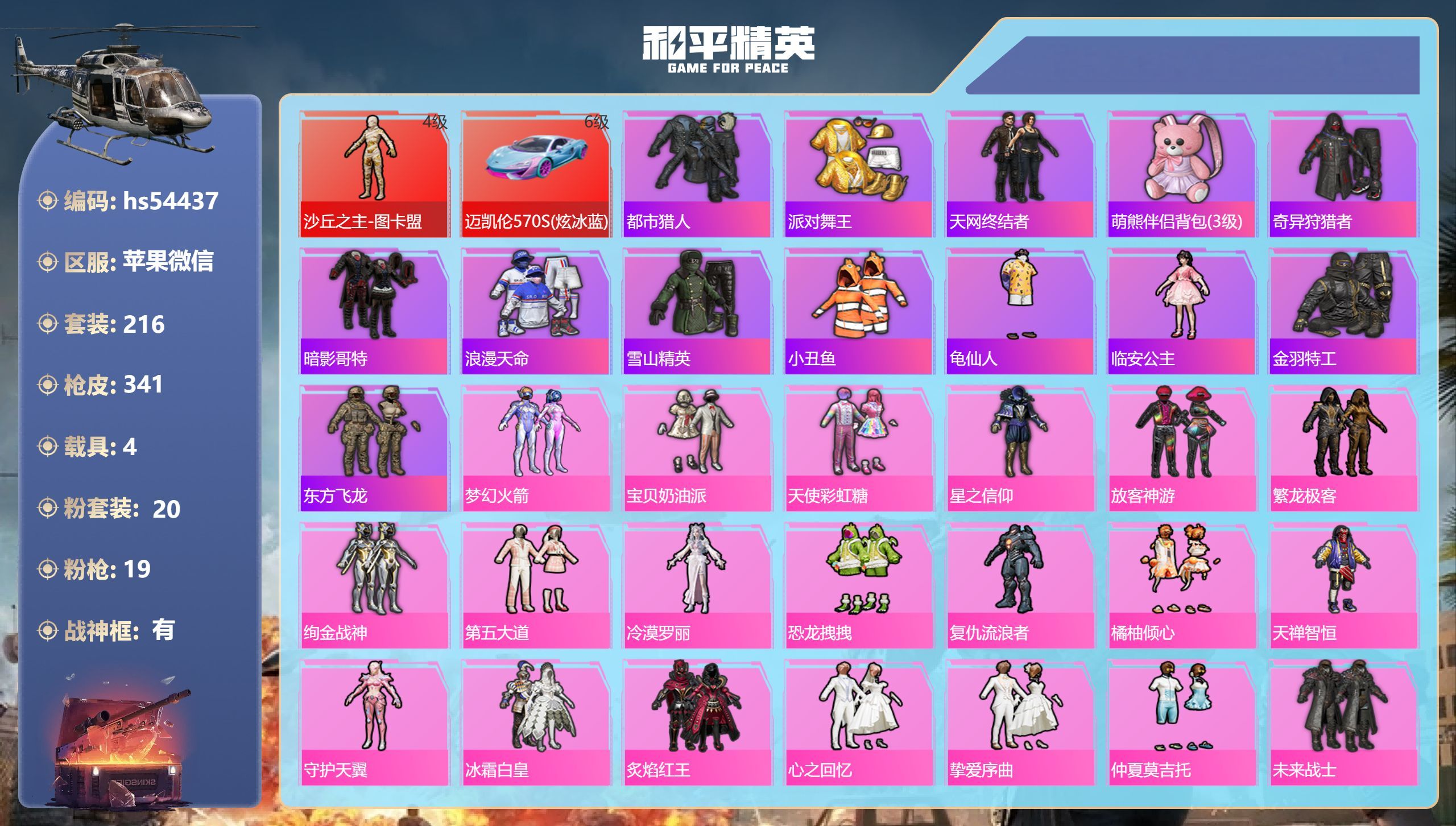 hs54437 苹果v-20王牌印记-有战神框-1红装-20粉装-19特效枪-4载具-124392