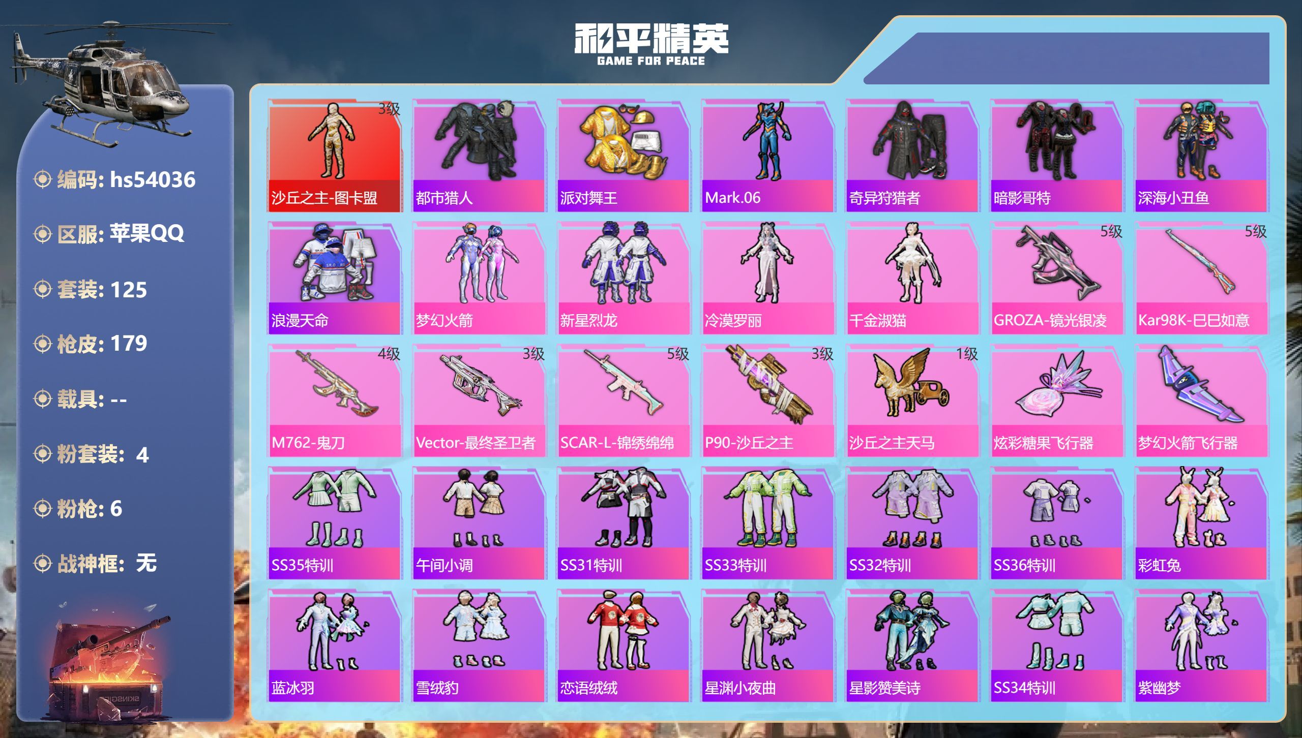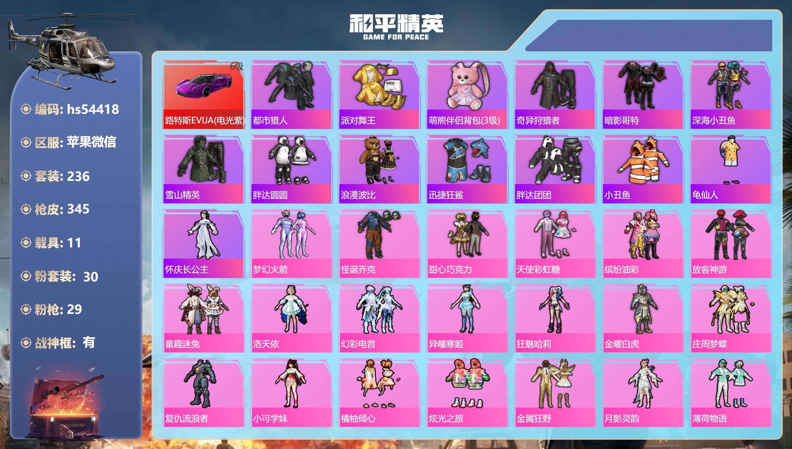 hs54425 苹果v-3王牌印记-6粉装-7特效枪-1载具-35680热力值-72套装-101枪