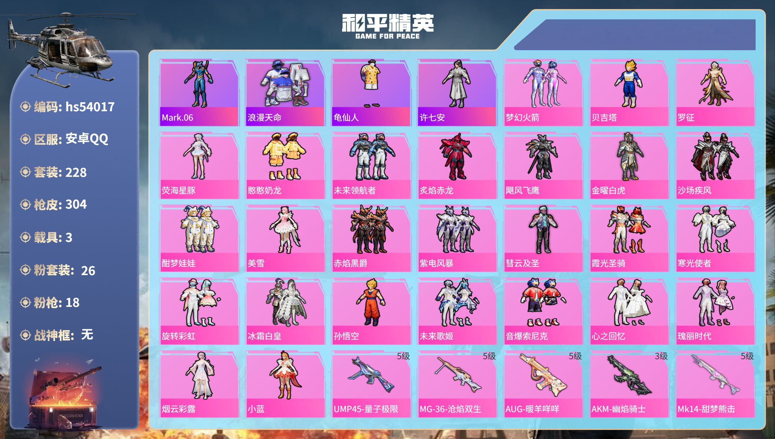 hs54017 安卓手Q-15王牌印记-26粉装-18特效枪-3载具-106448热力值-228套装