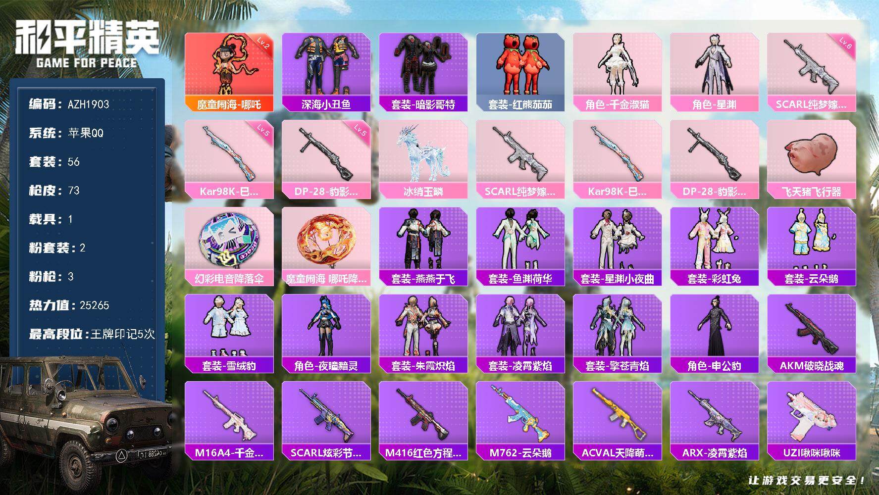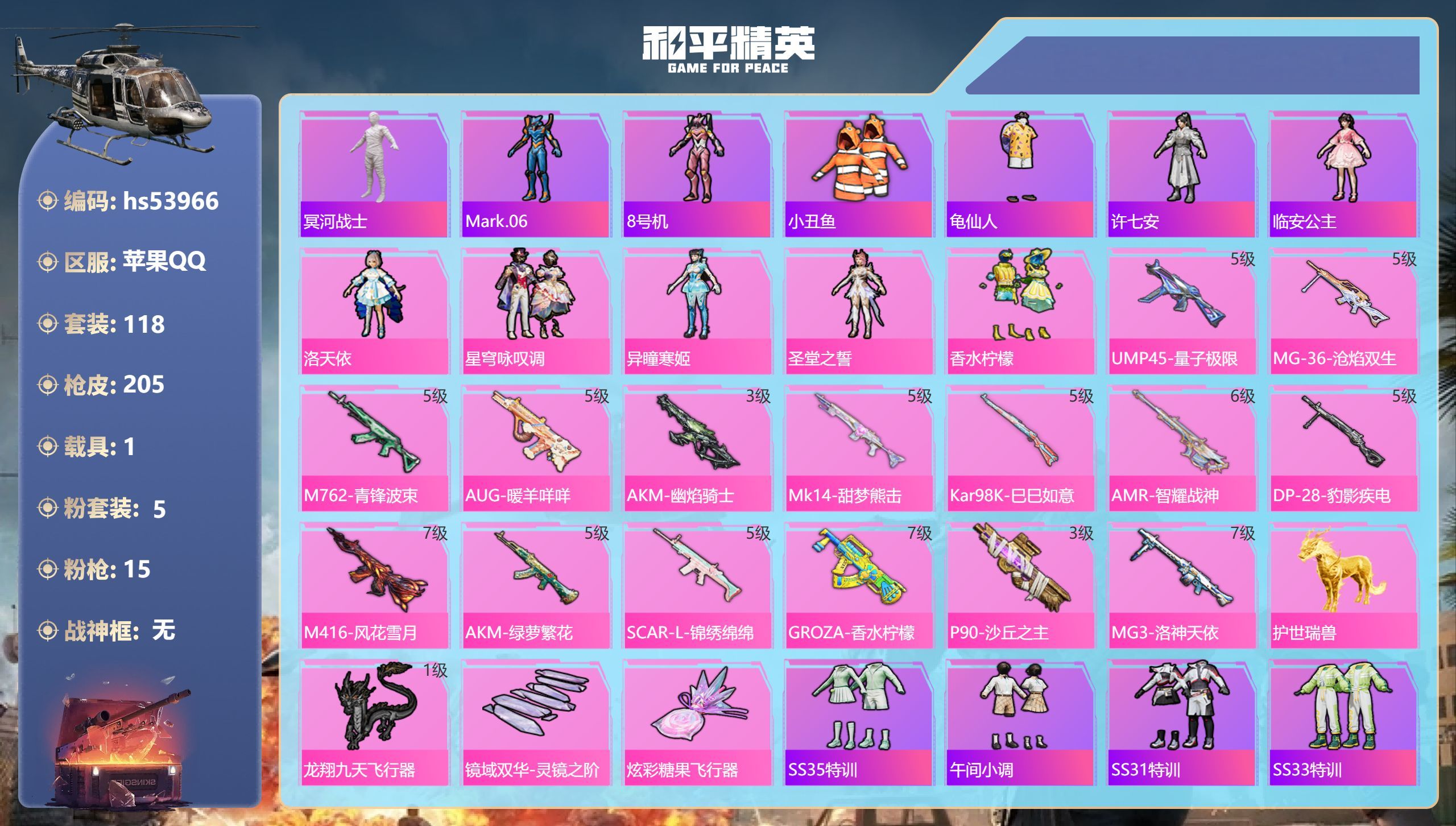 hs53966 苹果手Q-12王牌印记-5粉装-15特效枪-1载具-68481热力值-118套装-2