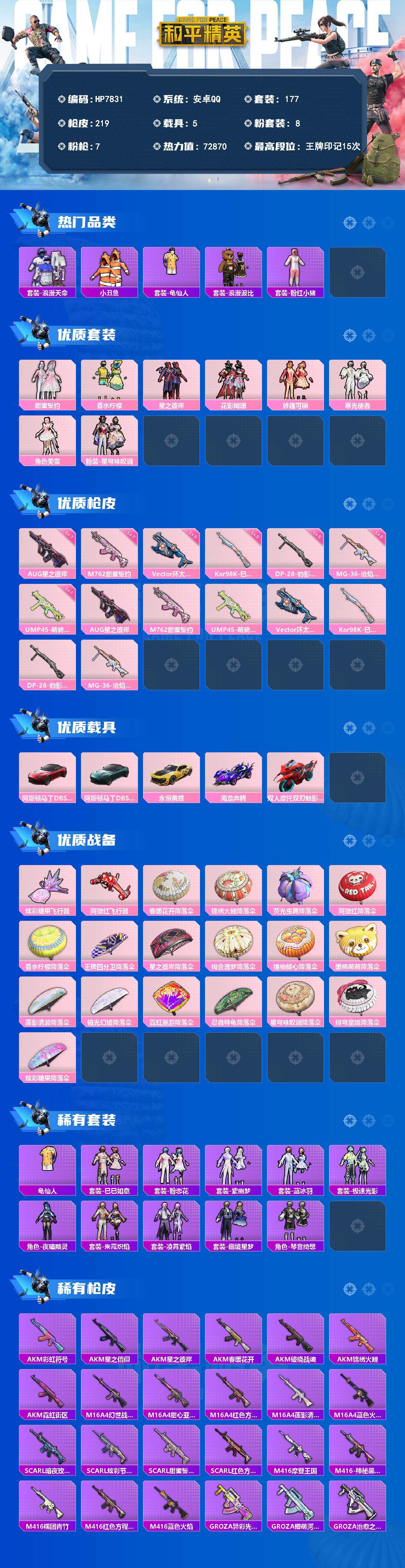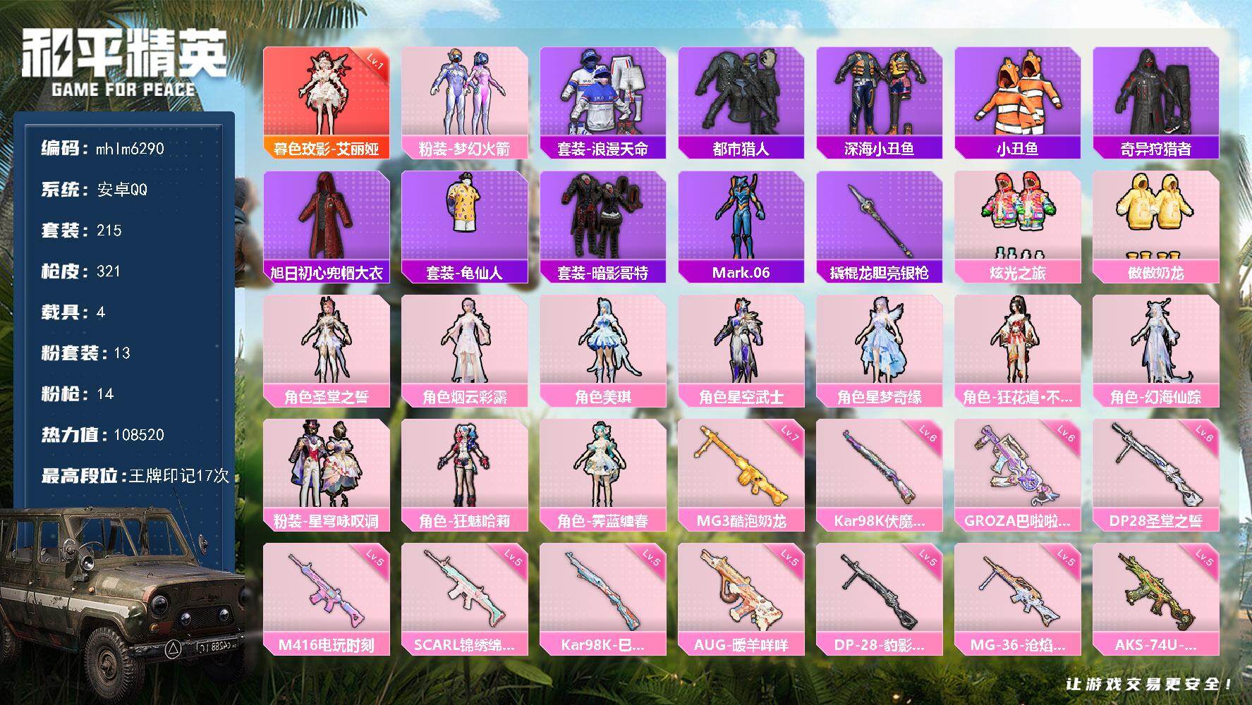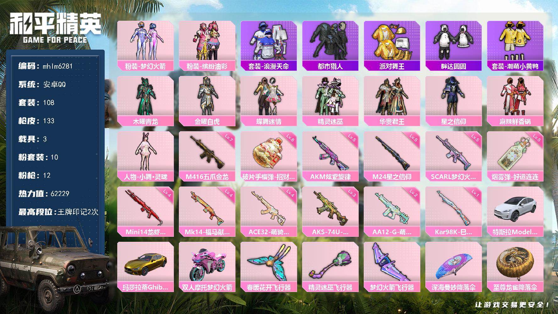 【mhlm6283】安卓 手Q-1神装-6粉装-15特效枪-2载具-6粉色飞行