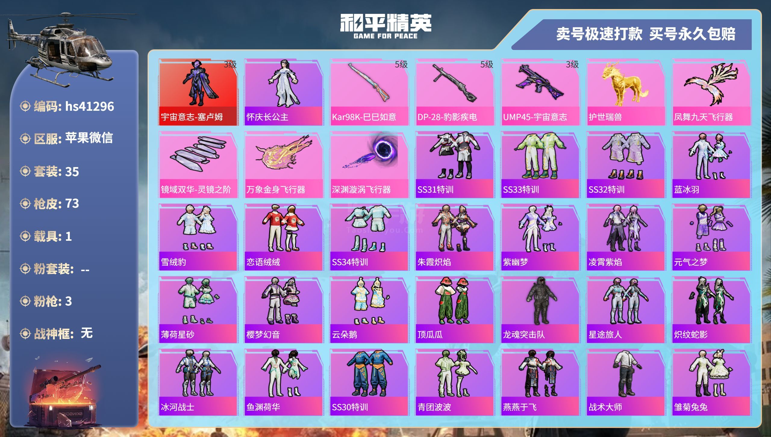 hs41296 苹果微-2王牌印记-0粉装-3特效枪-1载具-24611热力值-35套装-73枪皮