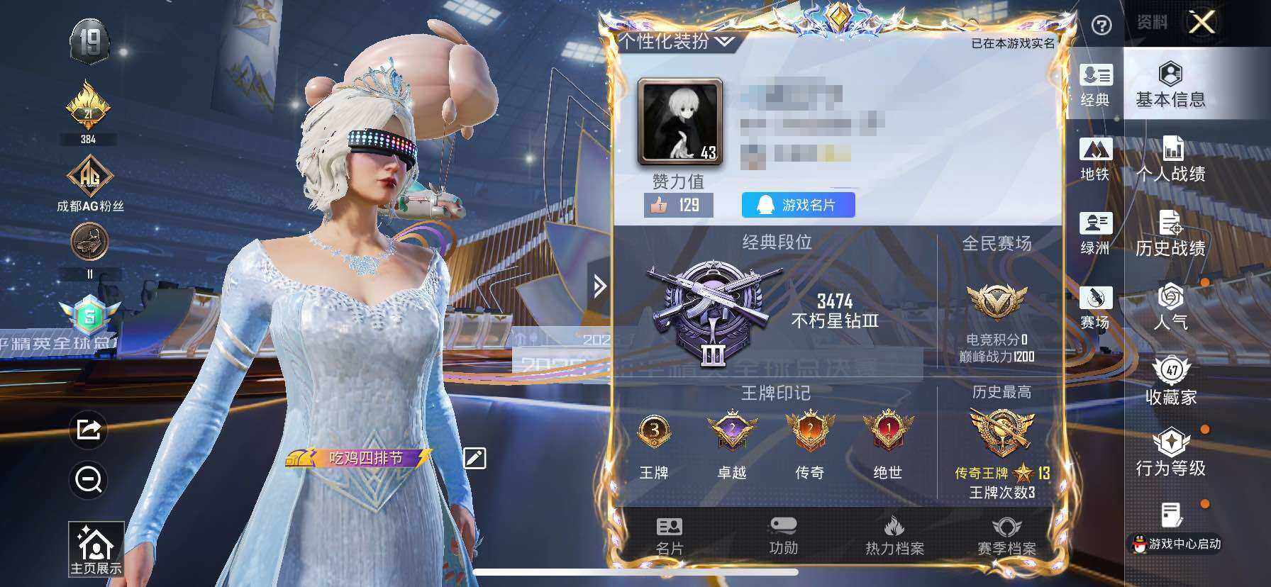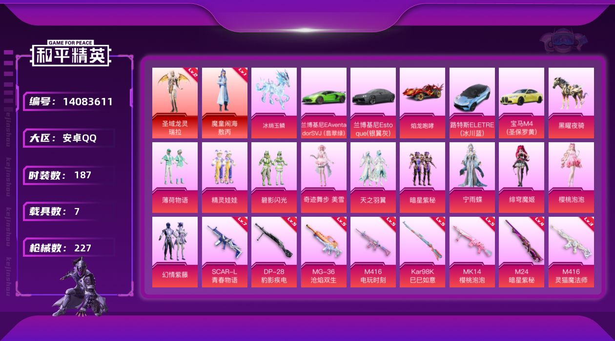 时装数: 132 载具数: 3 枪械数: 45 战备数: 42 神级装扮: 辉