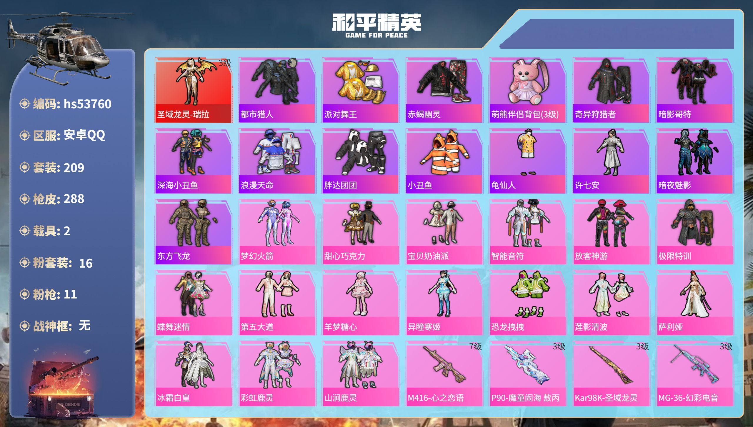 hs53772 安卓手Q-23王牌印记-19粉装-8特效枪-2载具-138836热力值-333套装-