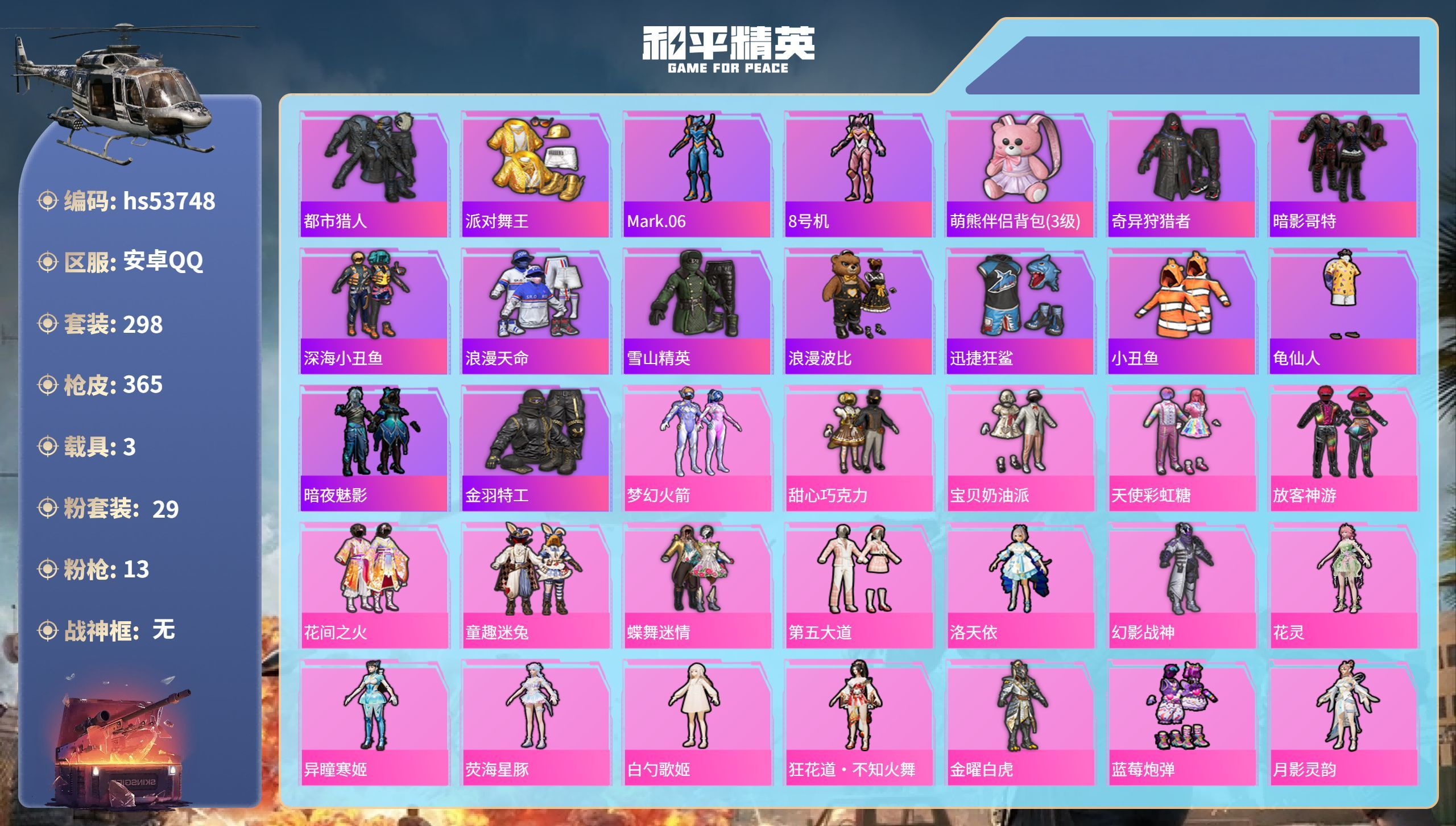 hs53748 安卓手Q-21王牌印记-29粉装-13特效枪-3载具-133429热力值-298套装
